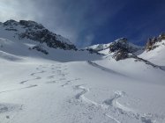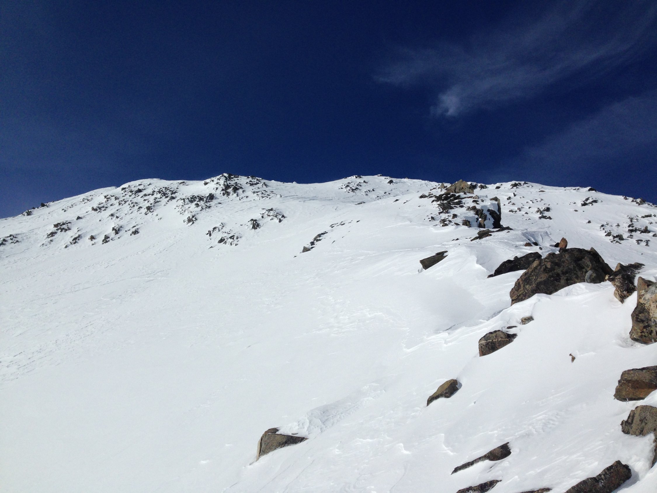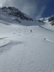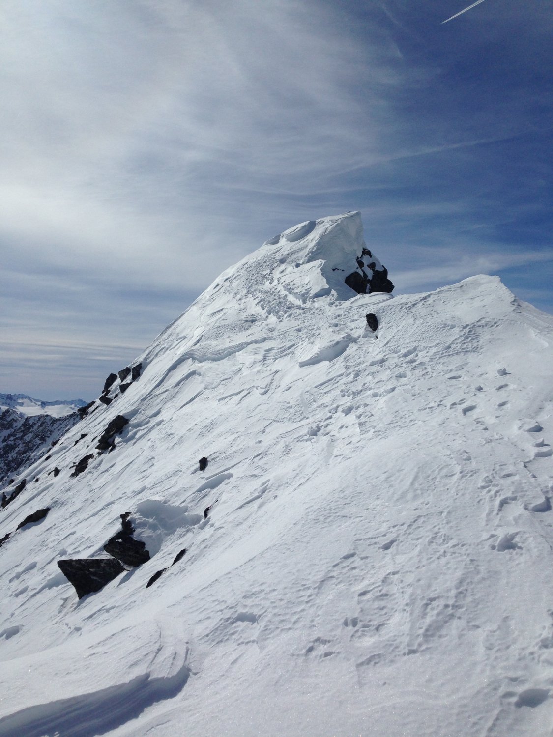 Das Guivstöckli haben wir rechts liegen gelassen und sind direkt zum Punkt 2617 abgefahren. Verhältnissen super; leichter Pulver. Ab da auf direktem Weg hoch zum Piz Guiv. Wir konnten praktisch bis zum Gipfel mit den Skiern hoch. Die letzten paar Meter in einfachem Trittschnee zum Gipfel. Achtung auf die grosse Wächte am Gipfelgrat. Bis da mussten wir alles selber spuren.