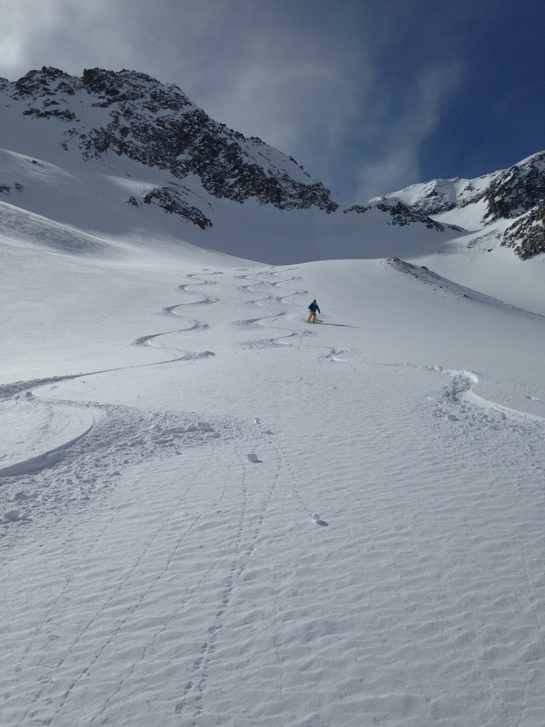 Vom Piz Guiv entgegen der Routenbeschreibung oben im bestem Pulver / Triebschnee runter zur Etzlihütte. Nach kurzer Pause ab da auf zur Mittelplatte hoch und in nassem Schnee runter nach Rueras; auf den Skiern bis zum Bahnhof.