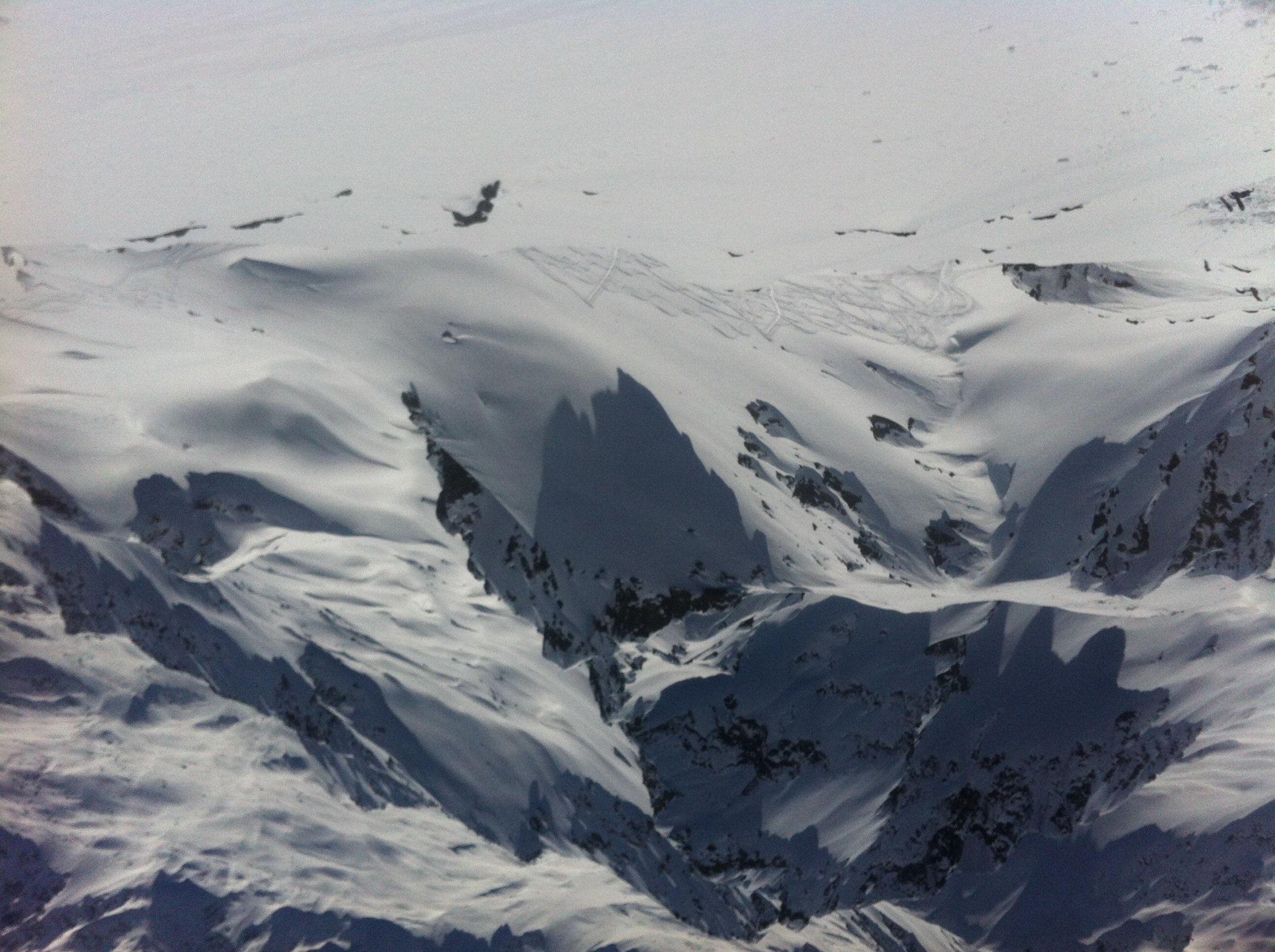 südlich der Felszacken 2753m. Vom Tschuggerberg runter aufgeweichter Bruchharsch, manchmal an klassische Sulzschneeabfahrten erinnernd (um 15 uhr).