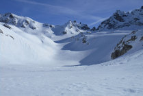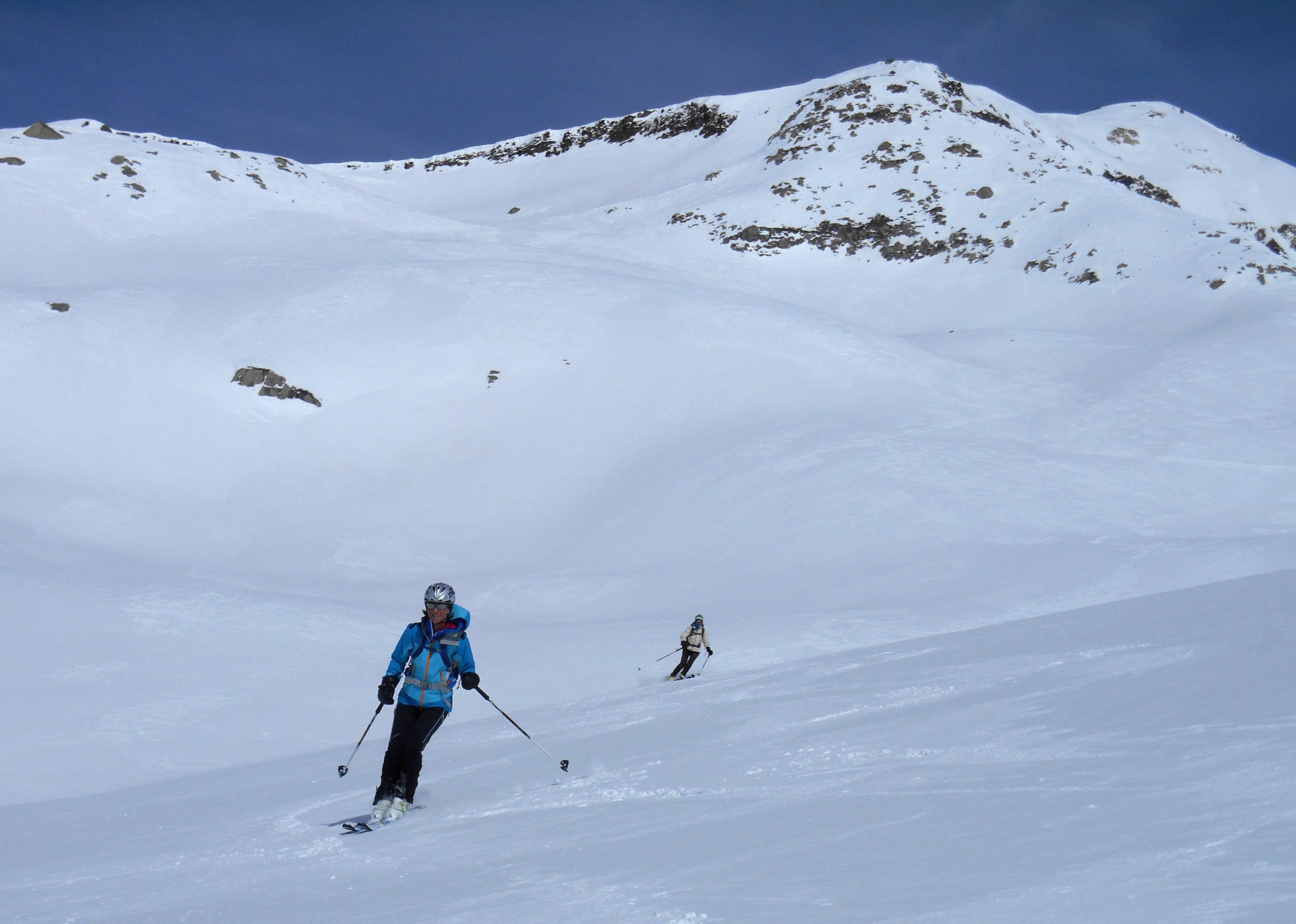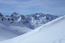 Der Wind hat in den letzten Tagen auch in diesem Gebiet seine Spuren hinterlassen. Oberhalb von 2500 m fanden wir hartgepressten Pulver vor (fast wie auf der Piste), weiter unten war der Schnee aufgeweicht, Sulzverhältnisse gab es aber noch nicht. Dies wird sich aber in den nächsten Tagen sicher ändern.