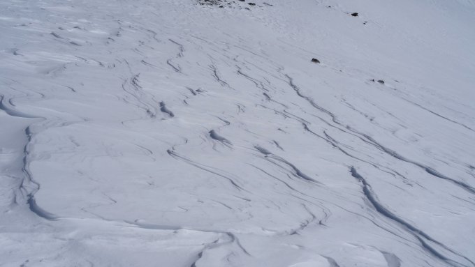 Gesamte Schneedecke von Anfang bis Schluss windbearbeitet. Südflanke des Calderas hart aber mehr oder weniger gut zu gehen mit Skiern (mit Splitboard etwas schwieriger und letzte Meter zu Fuss gemacht). Abfahrt über Pt. 3084 zur Jenatschhütte...nicht gerade ein Vergnügen da alles hart.