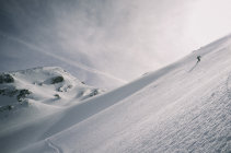 Abfahrt im Hang der Aufstiegsspur durch schönster Pulverschnee. Ab ca. 1750m durch lockere Büsche und durch Rinnen bis zu Alplen. Bis hier im Schatten Pulverschnee. An der Sonne mit leichtem Deckel.