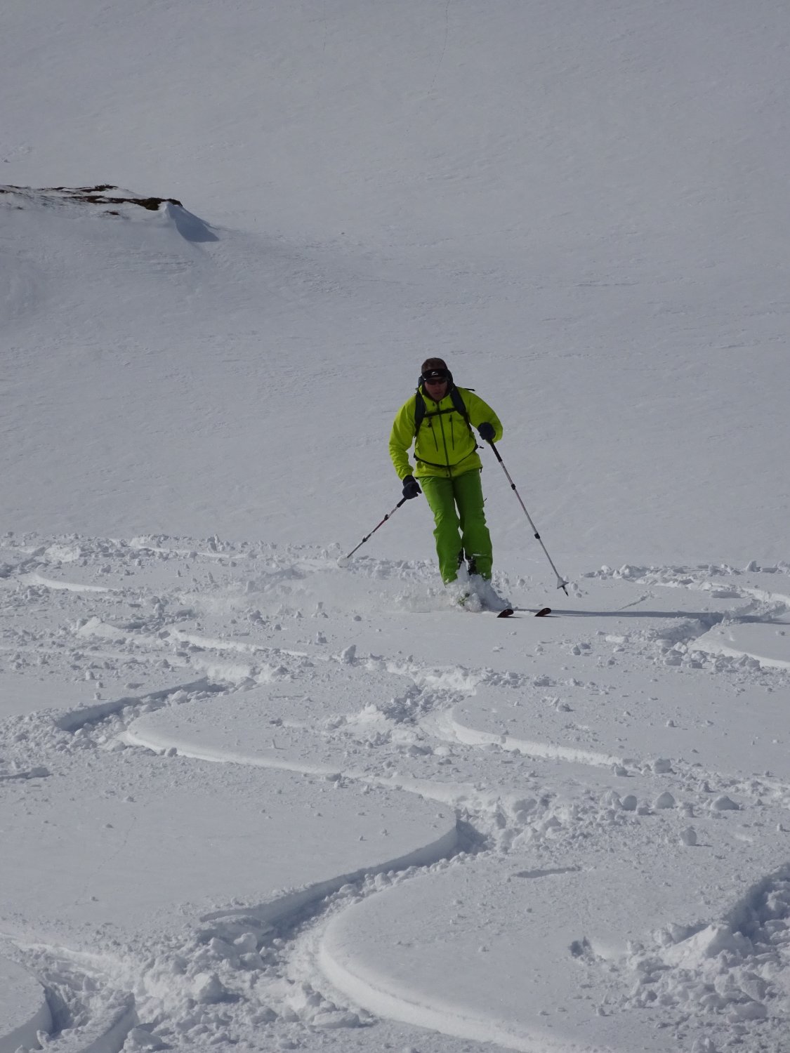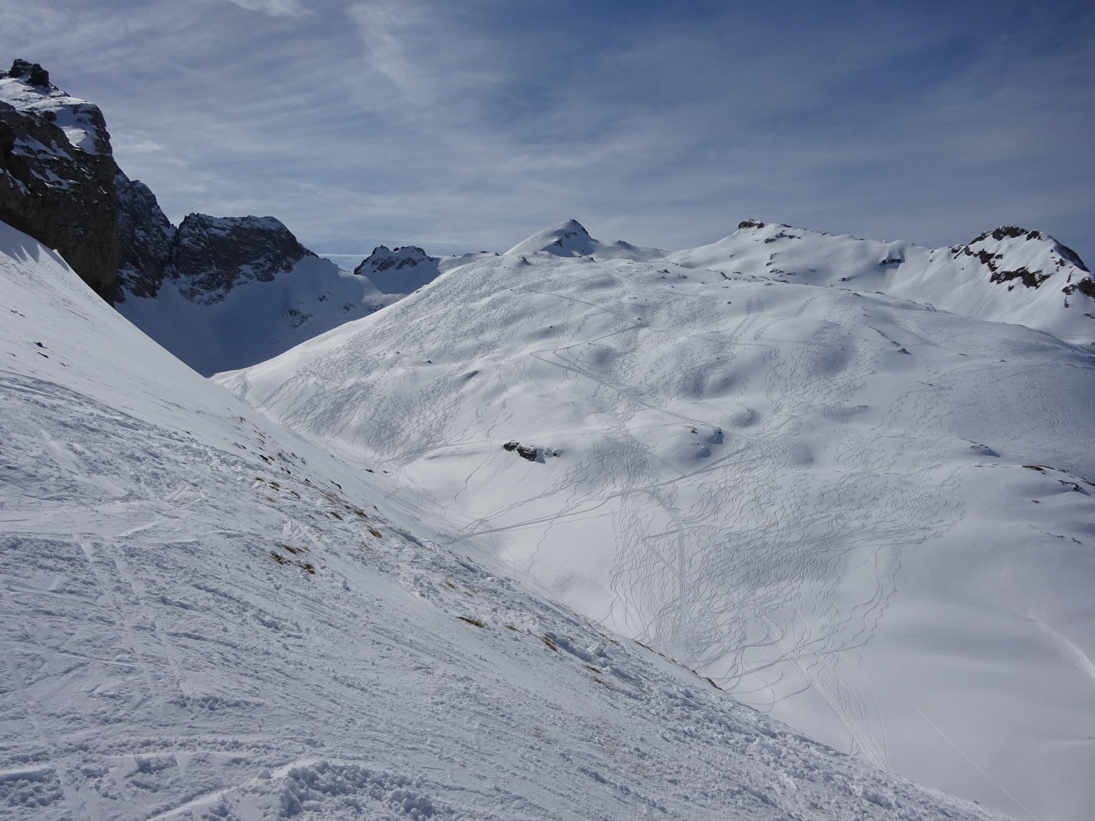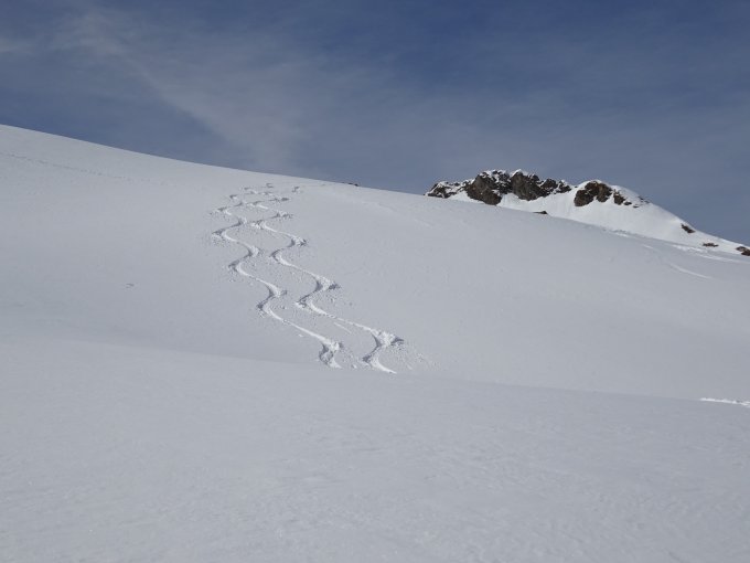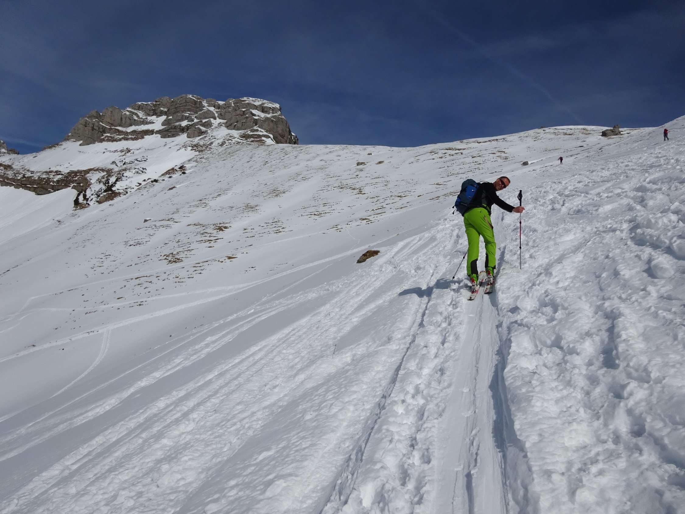 Sehr viele Tourengeher unterwegs, trotzdem haben wir noch Platz für unsere eigenen Spuren gefunden; Nordseitig noch Tiefschnee, Ostseite weicher, aber sehr gut fahrbar