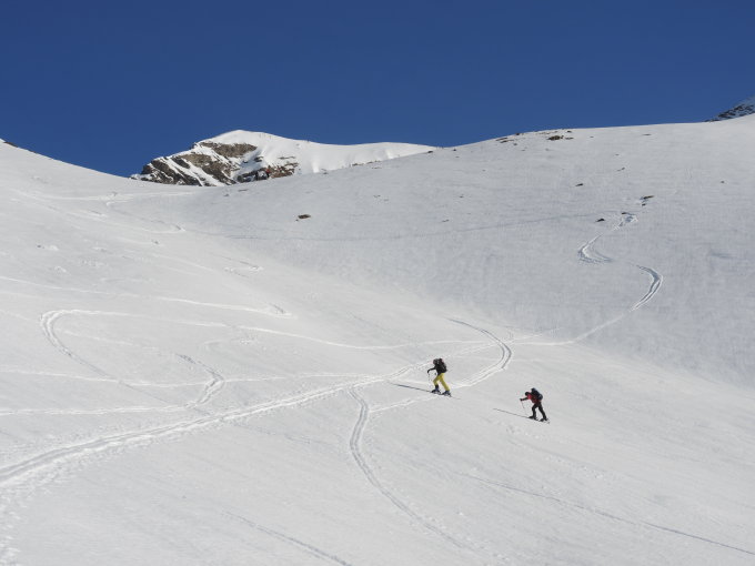 Frühlingsschnee, beste Abfahrtbedingungen zwischen 11 und 11.30, Sulzschnee vom Feinsten, im Schatten z.T. Bruchharst oder ab und zu Pulver. Im Gipfelhang Lawinenschnee und etwas ruppig