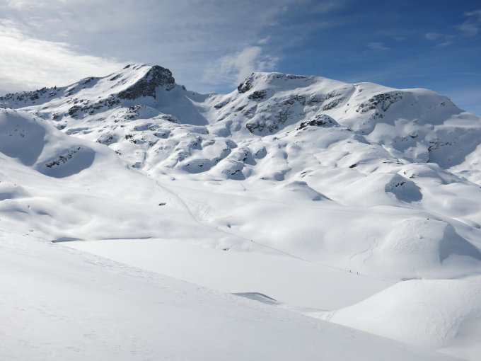 Gute und sichere Verhältnisse beim Aufstieg (Abmarsch um 12.00). Kurze aber "rassige" Halbtagestour. Schnee oben stark windverblasen, darum Abfahrt nicht überall ein Genuss. Lohnender Gipfel mit toller Aussicht.