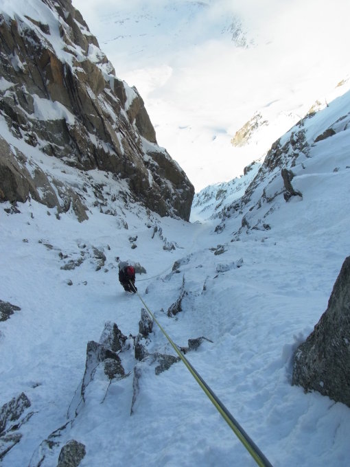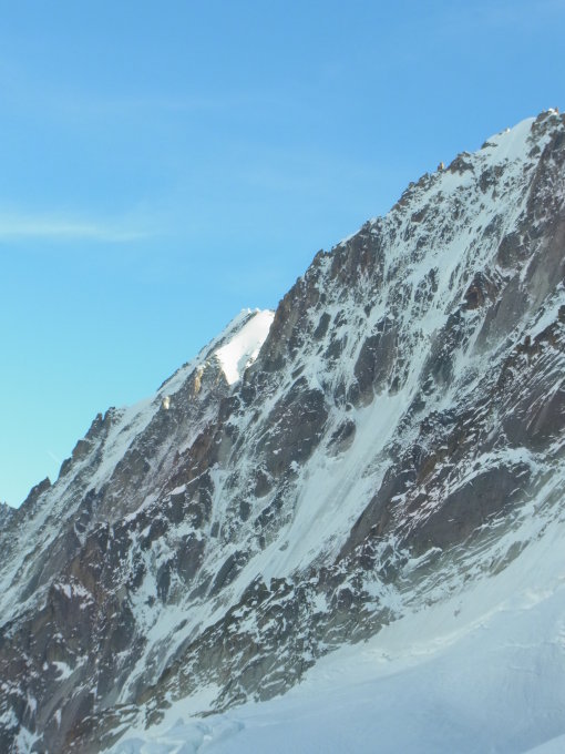 Eigentlich sehr gute Verhältnisse! Ausnahme: die Randkluft war recht heikel und hat Zeit gekostet ("Zuckerschnee"). Einen Tag vorher soll eine Seilschaft wohl deswegen umgedreht sein. Nach oben hin wurde es windiger. Die Tour wurde am Sa und So (Davaille) sowie am Mo von einer französischen Seilschaft gemacht.