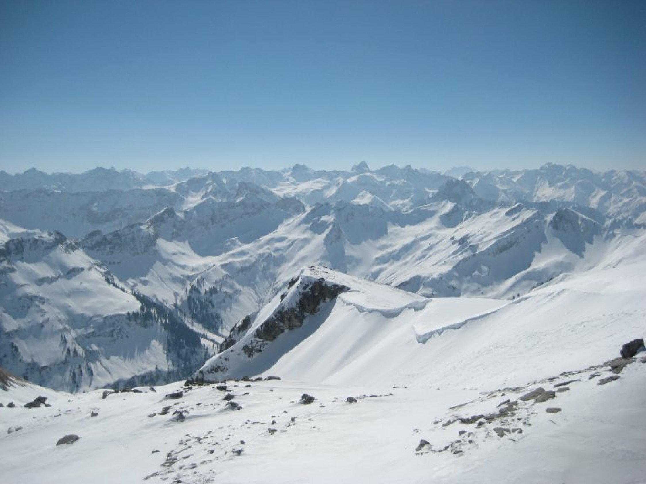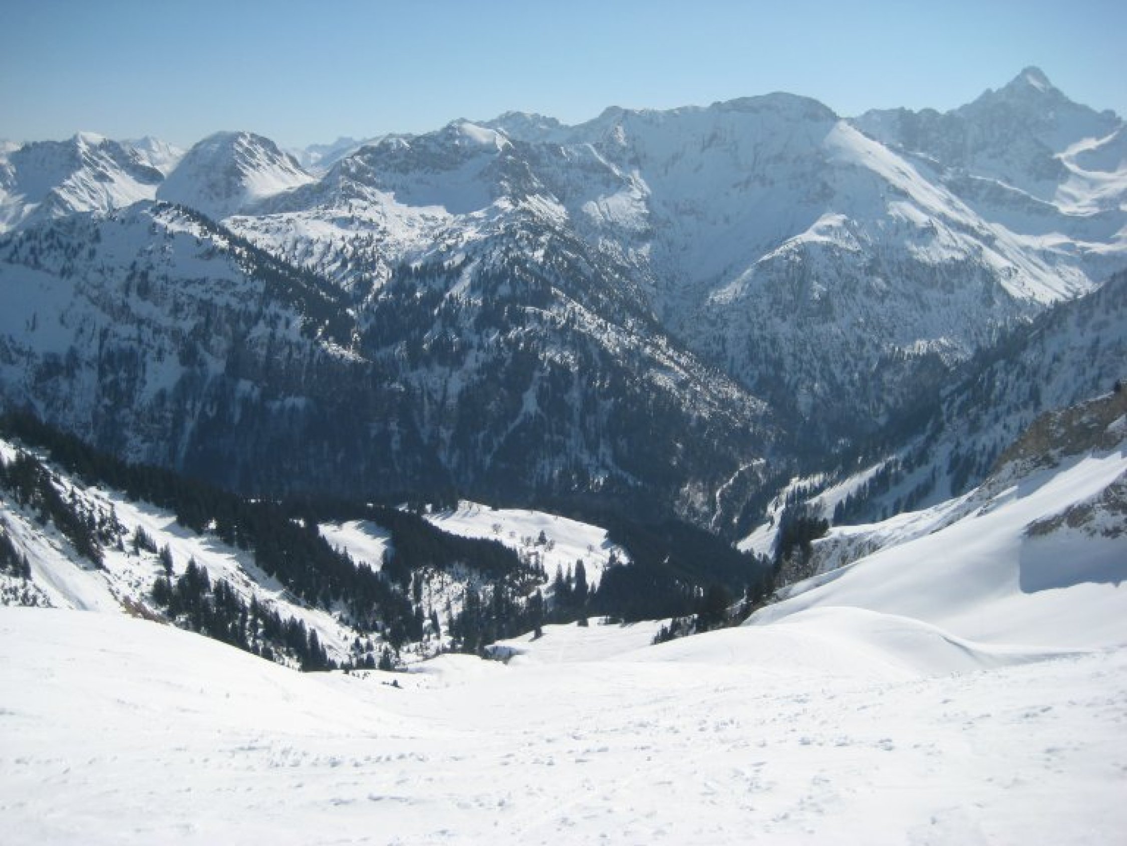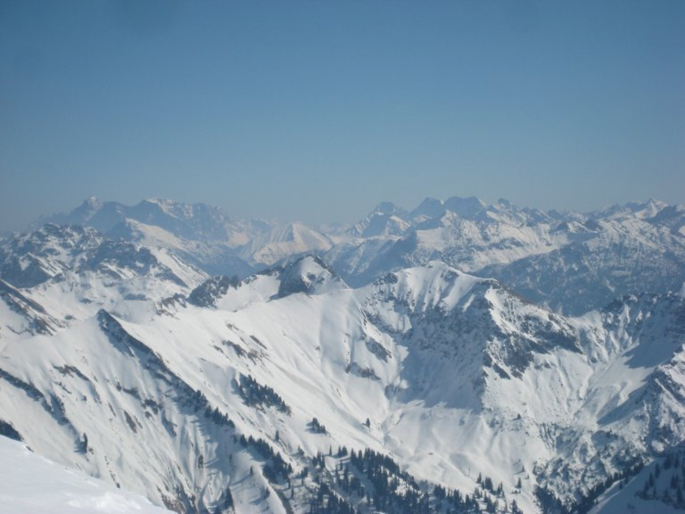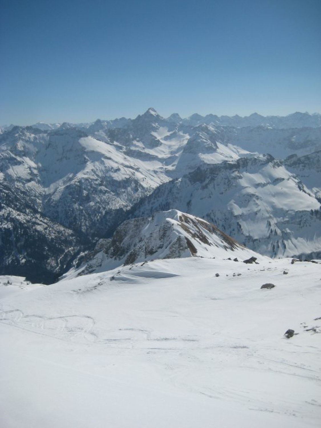 Zwischen Engeratsgund-u.Käseralpe wird es langsam stellenweise etwas mager, für Aufstieg reicht es alle mal. Gute Spur über Gundleshütte bis Gipfel (nur leider etwas Stollengefahr an den Fellen). Leichte Bise aber wer will an einem solchen Traumtag das Haar in der Suppe finden. Bei richtige Wahl hat die Abfahrt immer noch das Prädikat "sehr gut" oben alles tragend dann bester Firn. Heute ganze 3 Mann von der Seite und am Gipfel.