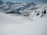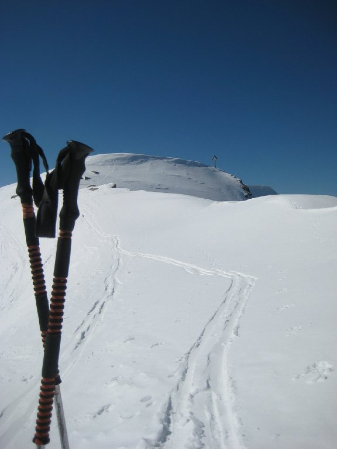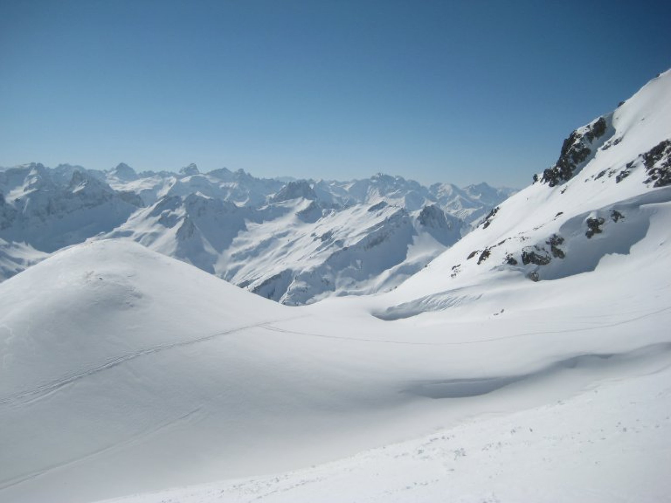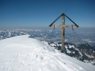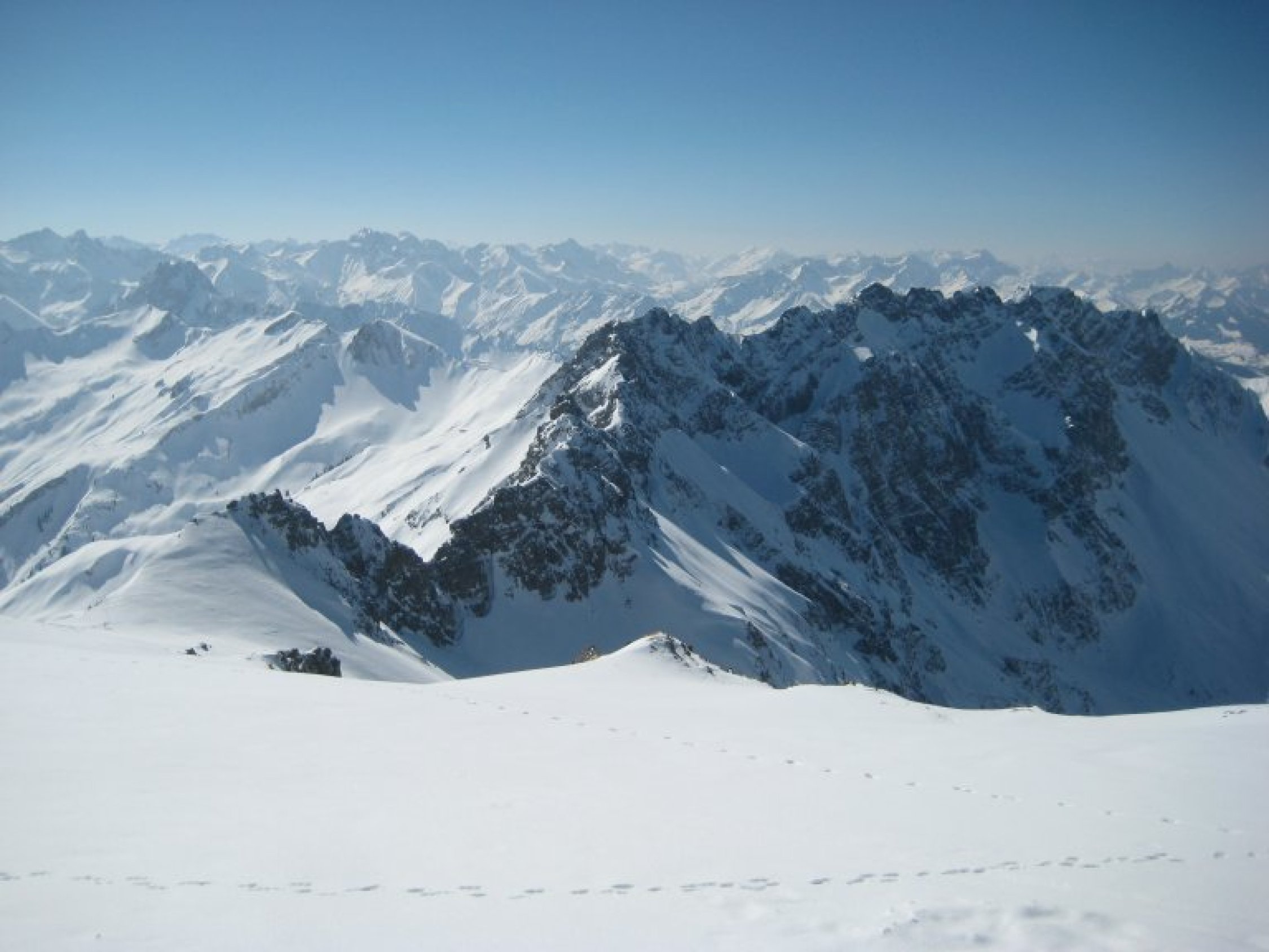 Zwischen Engeratsgund-u.Käseralpe wird es langsam stellenweise etwas mager, für Aufstieg reicht es alle mal. Gute Spur über Gundleshütte bis Gipfel (nur leider etwas Stollengefahr an den Fellen). Leichte Bise aber wer will an einem solchen Traumtag das Haar in der Suppe finden. Bei richtige Wahl hat die Abfahrt immer noch das Prädikat "sehr gut" oben alles tragend dann bester Firn. Heute ganze 3 Mann von der Seite und am Gipfel.