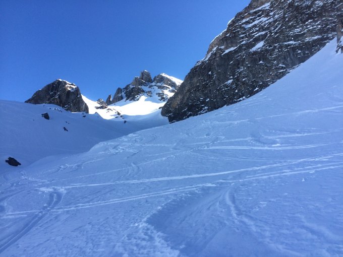 Aufstieg: sehr gute Verhältnisse, Harscheisen im obersten Teil (ab P 2334) nützlich. Wir haben uns für die Abfahrt durch den Schwarzgraben entschieden. Das hat sich gelohnt, hat es doch noch Pulverschnee.