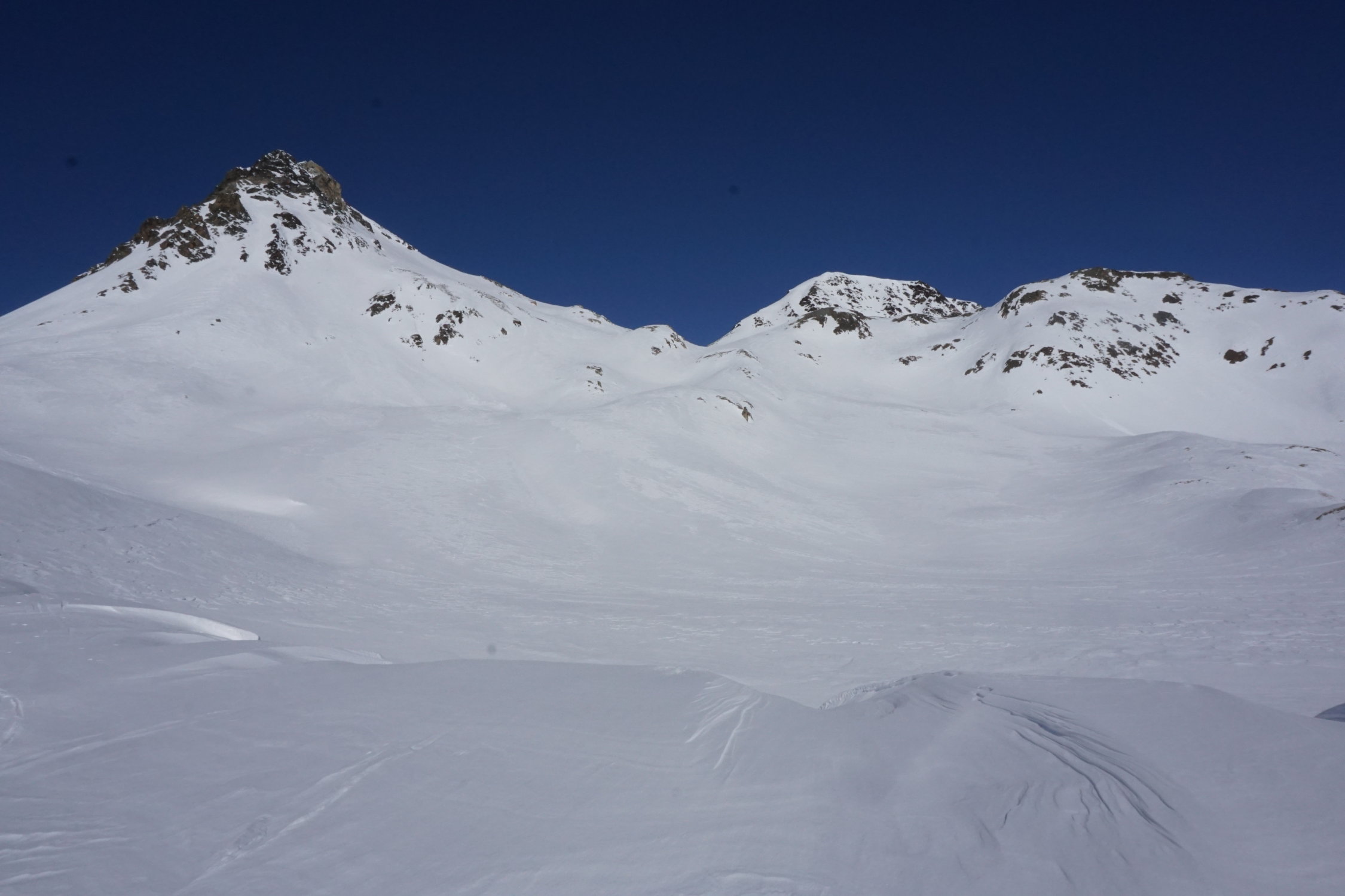 Unterhalb dem Sattel auf ca. 2700 ist ein grosses Schneebrett abgegangen. Muss vor 2 bis 3 Tagen gewesen sein.