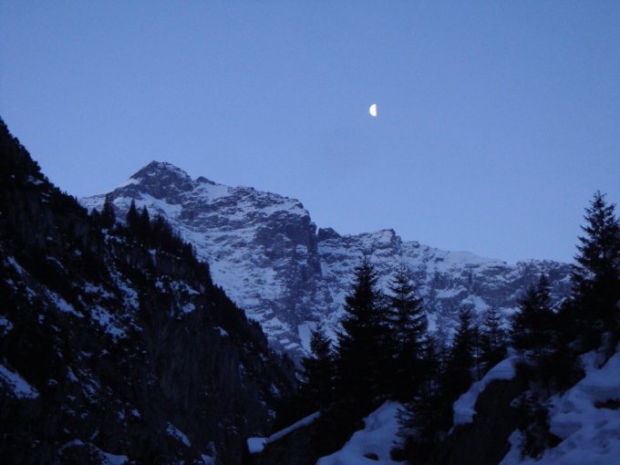 Start bei Brücke 1023m bei -4°C um 6:45. Aufstieg bis 1440m auf der Waldstrasse, danach auf guter Spur hinauf durch die Chälen. Aufstieg im Moment gut ohne Harsteisen zu machen, etwas frisch war's. Oben nun weiter in der Sonne sehr angenehm. Kurz vor dem Skidepot doch noch Harsteisen montiert, war angenehmer zu laufen. Für Gipfelaufstieg Steigeisen montiert, wäre aber im Moment auch ohne gangbar. Schönstes Wetter am Gipfel und tolles Panorama. Immer wieder schön diese Gross Ruchen Skitour. Abfahrt im oberen Teil etwas ruppig, dann zwischen 2840 - 2660 rechts haltend über Ruchenfirn hinab in noch recht schönem Pulver. Unten dann mit etwas Stockeinsatz retour zur Chälen. Diese in unterschiedlichen Verhältnissen hinab. Im oberen Teil unangenehm zu fahren, dfür im unteren Teil noch einiges an Pulver gefunden. Am Schluss der Strasse entlang retour.