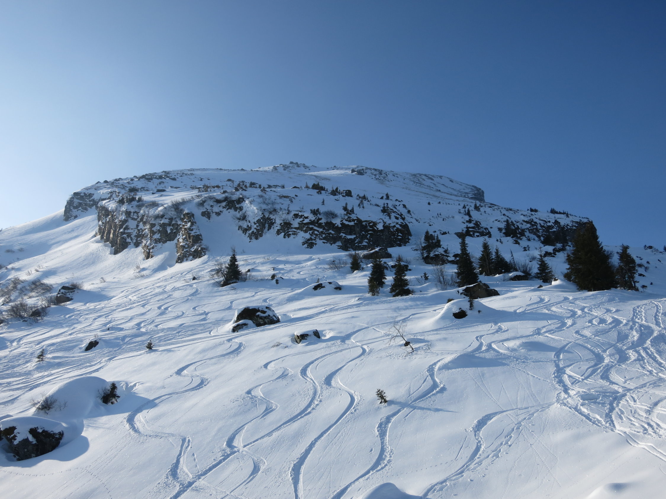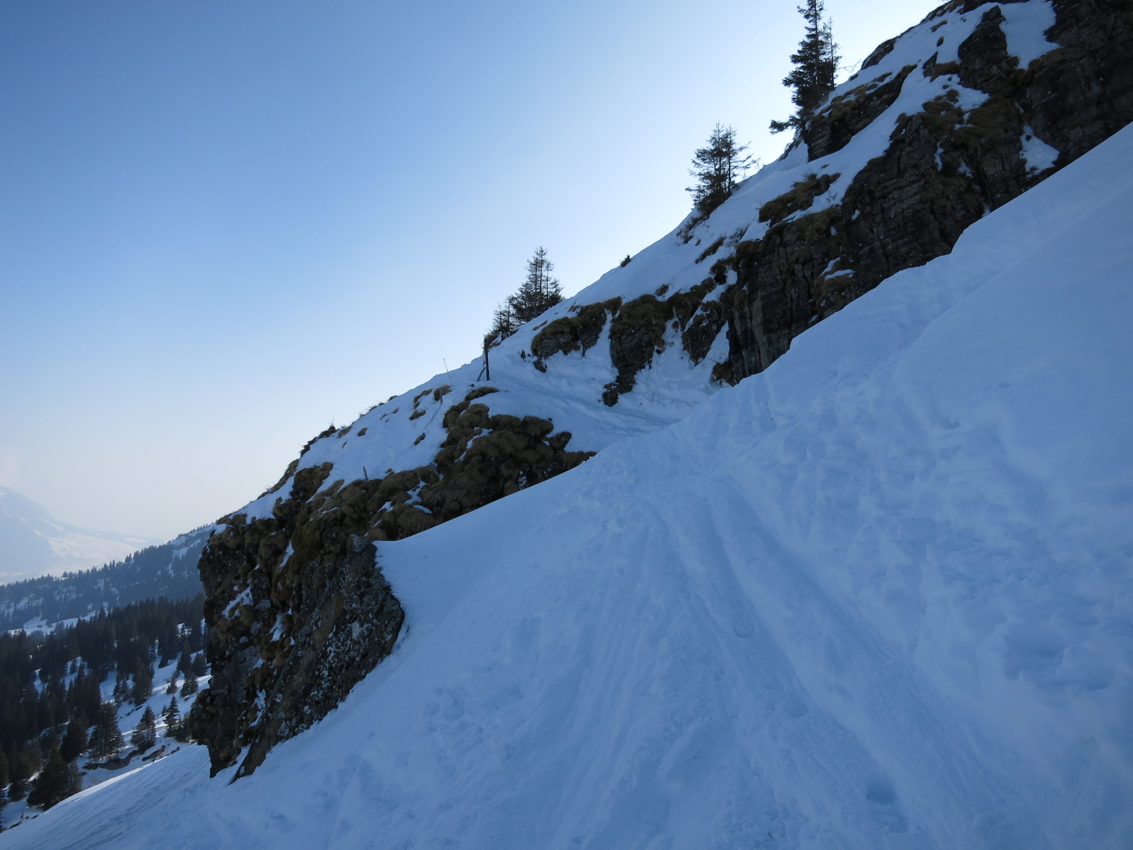 Abfahrt: Spuren von Pulver in der Mulde aber schon arg zerfahren und eher mühsam (um 10:30 Uhr), neben der Felsstufe kann mit entsprechender Vorsicht problemlos abgerutscht werden.