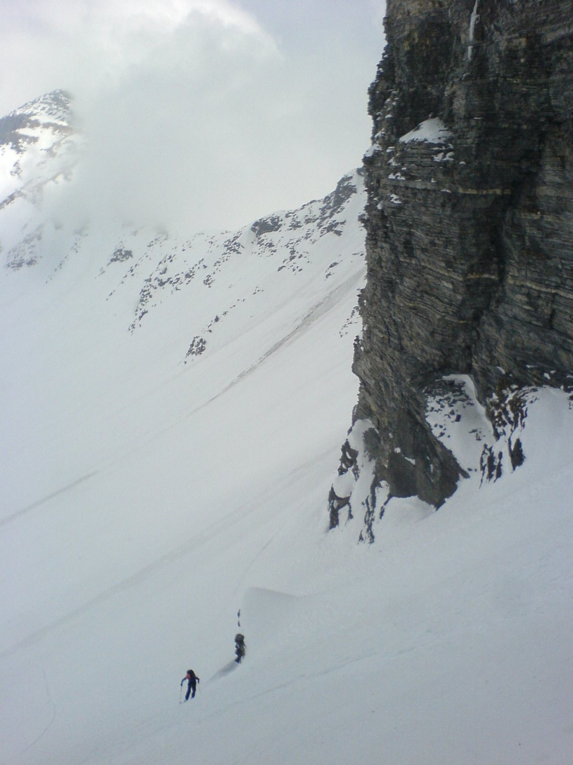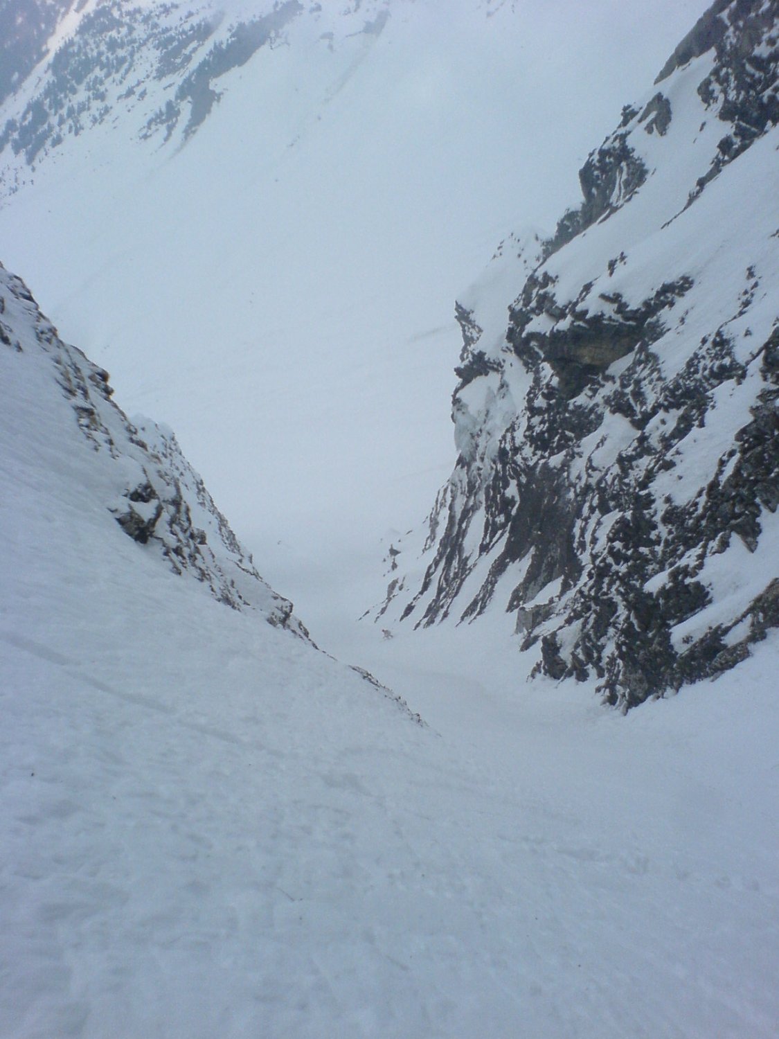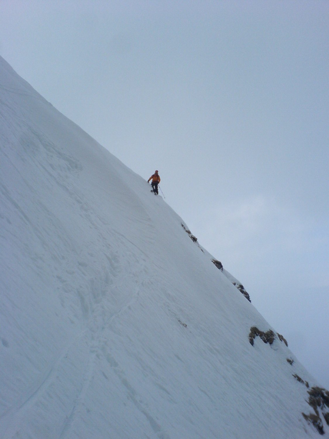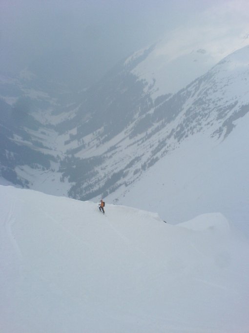 Gute Verhältnisse! Ab ca. 1600m an abscheinigen Hängen noch Pulver, nur selten oder leicht gedeckelt. Im Couli findet sich in der Mitte ein Streifen mit perfektem Trittschnee für den Aufstieg; in den Randbereichen hingegen ist der Schnee noch locker. In der ausgesetzten Traverse bodenloses Gewühl, sodass wir uns direkt an eine Felsrippe hielten. In der Abfahrt konnte diese zeitraubende Passage links in knietiefem Powder umfahren werden. Auch oben raus noch schöne Pulverhänge, leider wollte dann das Wetter nicht so recht mitspielen: dichter Nebel und Whiteout im obersten Teil. Eine verwaiste Spur vom östlichen Couli herkommend führte auf den Gipfel. Imposante Abfahrt durchs Couli, unten raus dank fehlender Einstrahlung und Wärme kaum aufgesulzt, daher mit nur wenig Stockeinsatz zur Säge zurück.