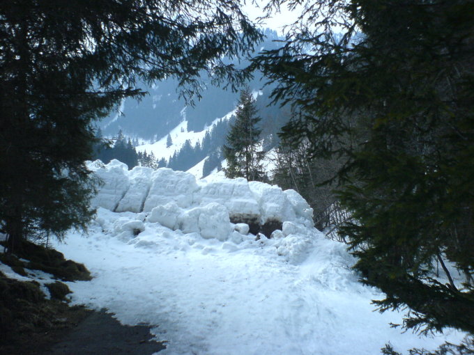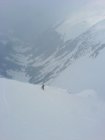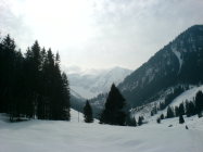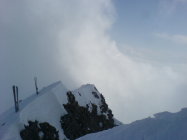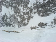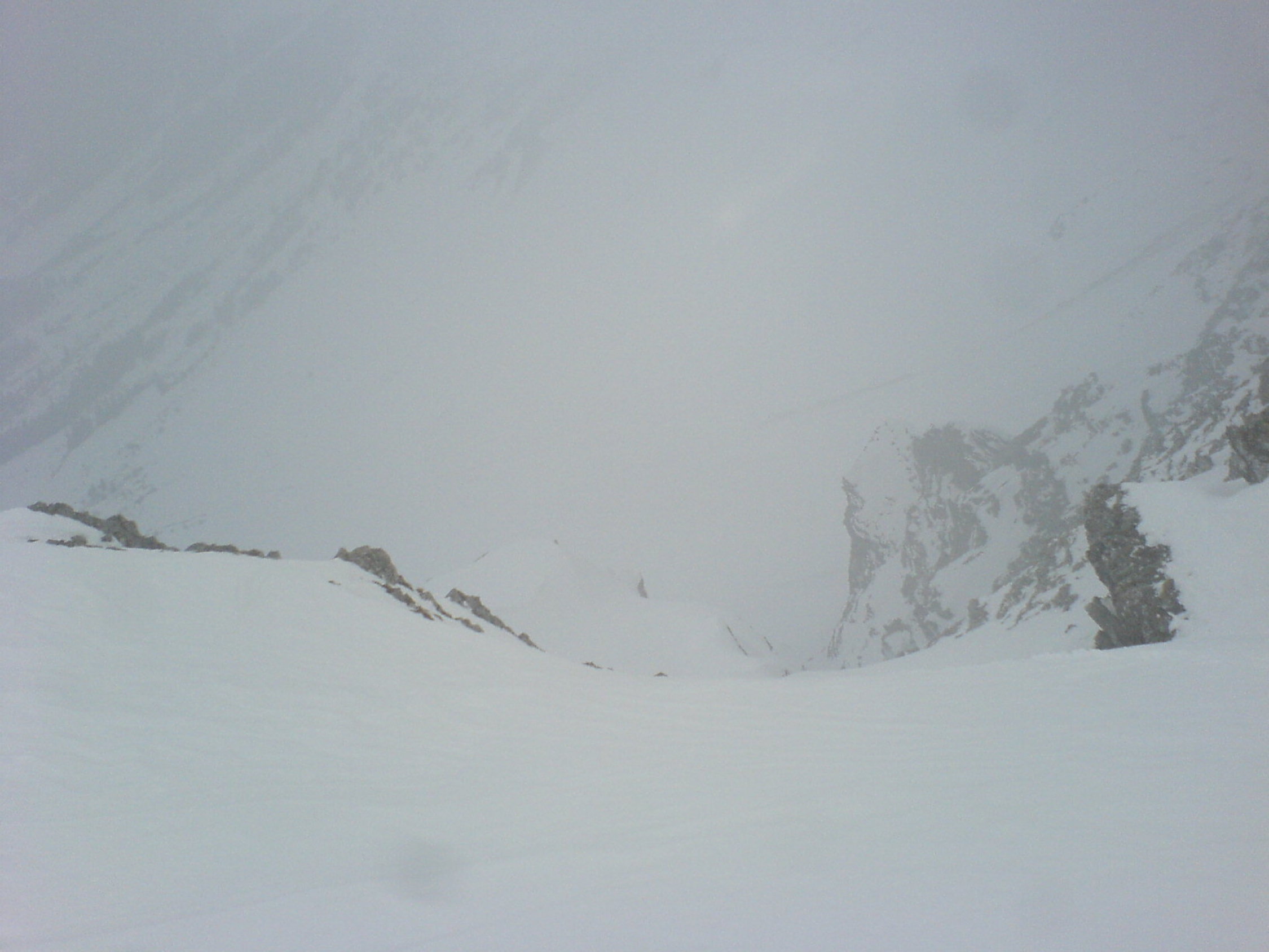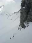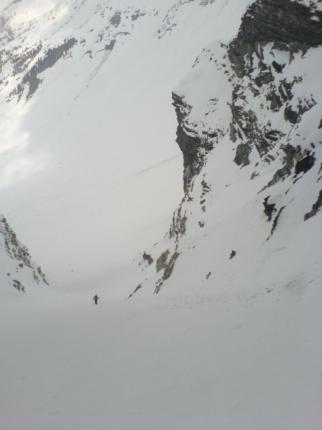 Gute Verhältnisse! Ab ca. 1600m an abscheinigen Hängen noch Pulver, nur selten oder leicht gedeckelt. Im Couli findet sich in der Mitte ein Streifen mit perfektem Trittschnee für den Aufstieg; in den Randbereichen hingegen ist der Schnee noch locker. In der ausgesetzten Traverse bodenloses Gewühl, sodass wir uns direkt an eine Felsrippe hielten. In der Abfahrt konnte diese zeitraubende Passage links in knietiefem Powder umfahren werden. Auch oben raus noch schöne Pulverhänge, leider wollte dann das Wetter nicht so recht mitspielen: dichter Nebel und Whiteout im obersten Teil. Eine verwaiste Spur vom östlichen Couli herkommend führte auf den Gipfel. Imposante Abfahrt durchs Couli, unten raus dank fehlender Einstrahlung und Wärme kaum aufgesulzt, daher mit nur wenig Stockeinsatz zur Säge zurück.