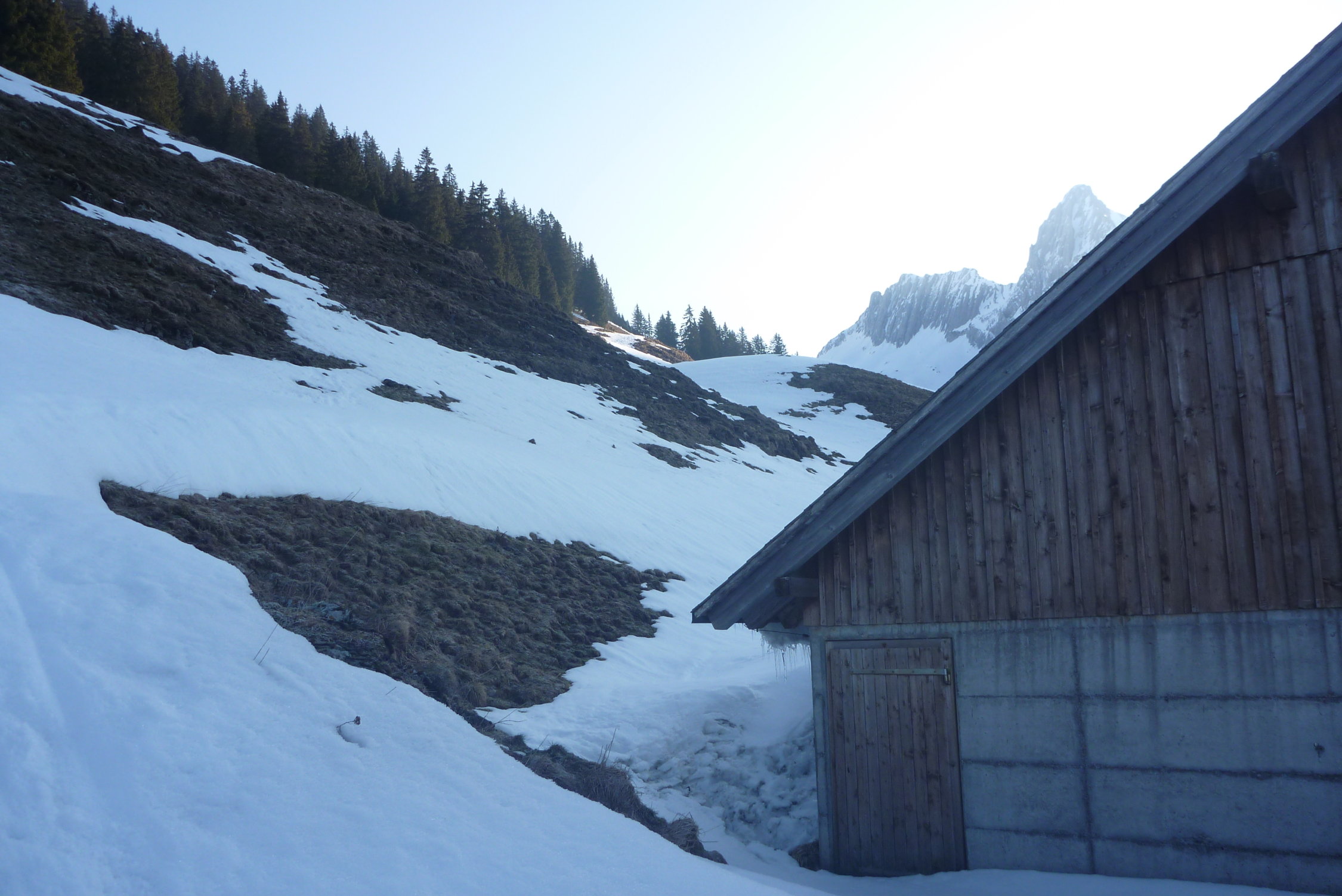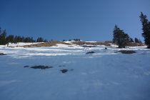 Im Moment gerade noch genug Schnee. Am Anfang müssen die Ski 5 Minuten getragen werden, danach kann man sich durch Schneefelder zu den Hütten schlängeln. Ab dem Steilhang dann mehr oder weniger durchgehend Schnee. Allerdings kommt hier vor allem im unteren Teil auch schon viel Gras durch.