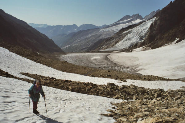 1. Tag Anstieg von Wiggen (Göscheneralp) in die Voralphütte. 2. Tag von der Hütte aus im Voralptal über den Wallenburnfirn bis zum Sustenjoch. Hier beeindruckt einmal der Blick ins Chalchtal/Meiental hinunter. In brüchigem, steinschlaggefährdetem und entsprechend rutschigem, aber sehr steilen Gelände geht es abwärts. Trittsicherheit und Grundkenntnisse der Klettertechnik (3-Punkt) sind hier gefragt, vor allem aber Vorsicht. Im Chalchtal gilt es die im diesjährigen warmen Sommer stark angeschwollenen Gletscherbäche zu überqueren. Aus Zeitgründen mussten wir auf die Sustenpasshöhe ansteigen (zusätzlich 300 m Anstieg).