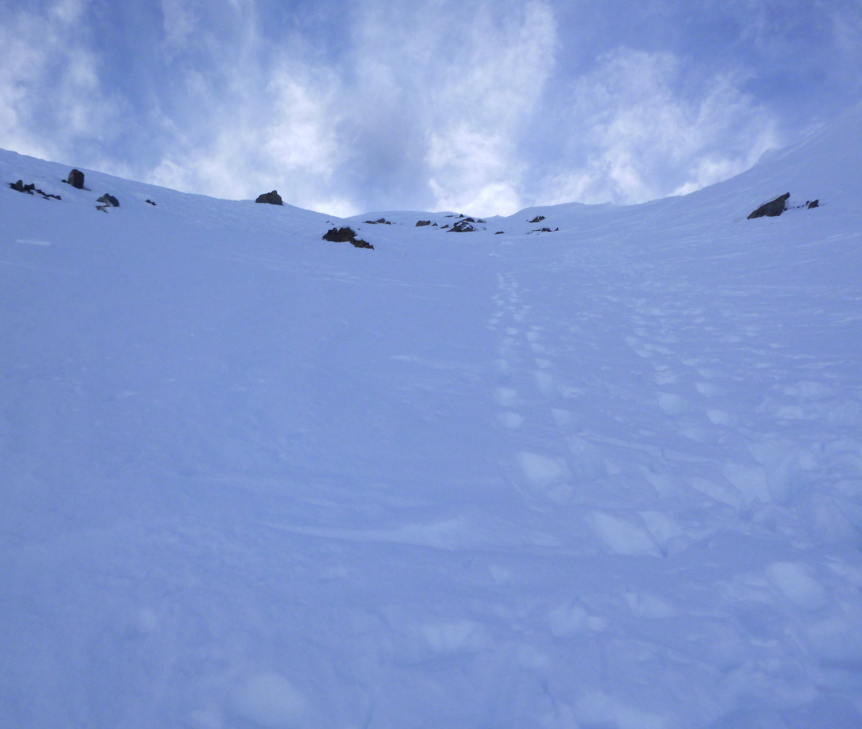 Gute Aufstiegsspur, teilweise in den steileren Stellen etwas rutschig, Harscheisen nicht unbedingt ein Luxus. Aufstieg NE Flanke sehr guter Trittschnee, Nordgrat ebenfalls gut, letztes Stück etwas exponiert.