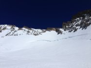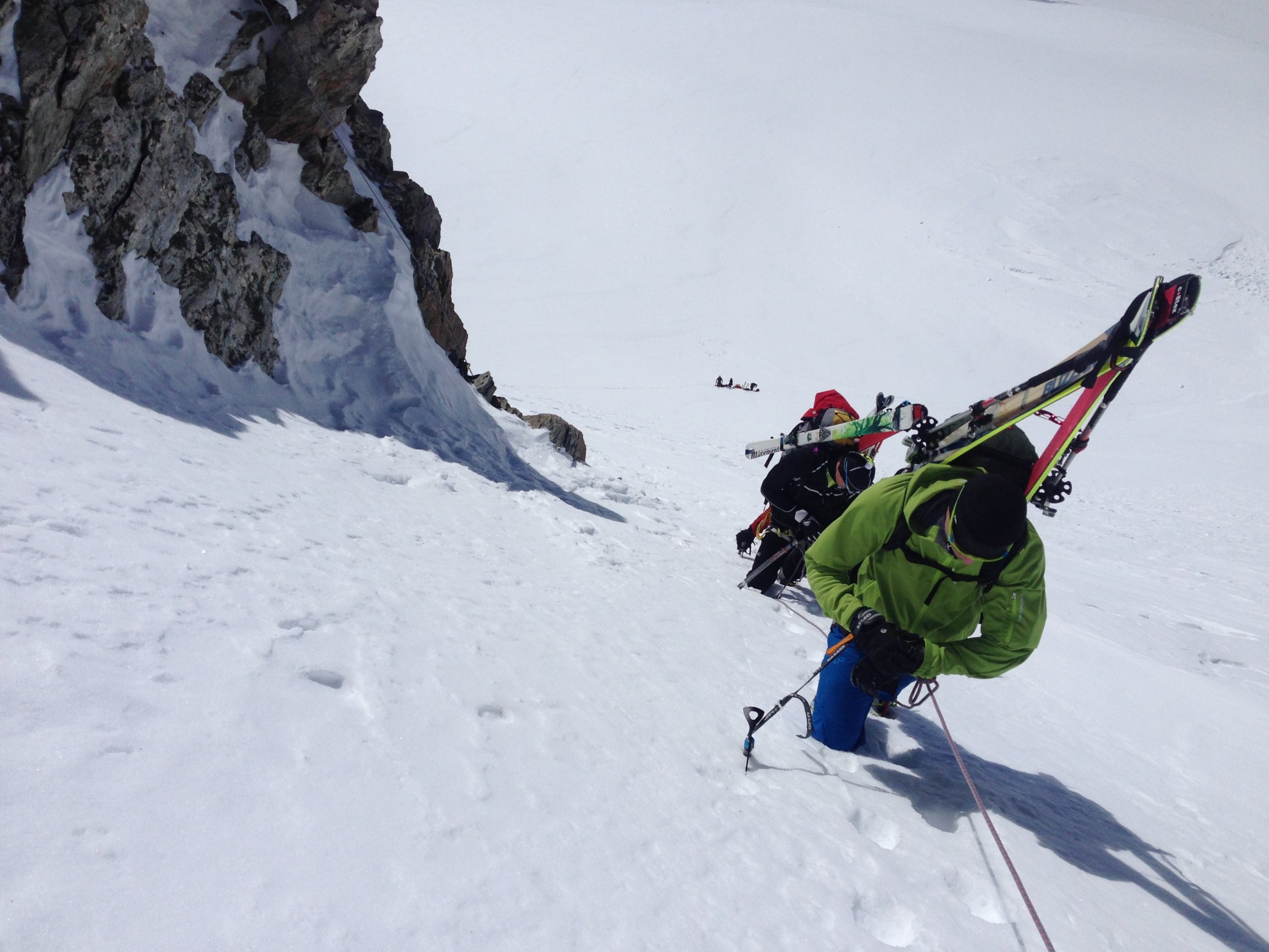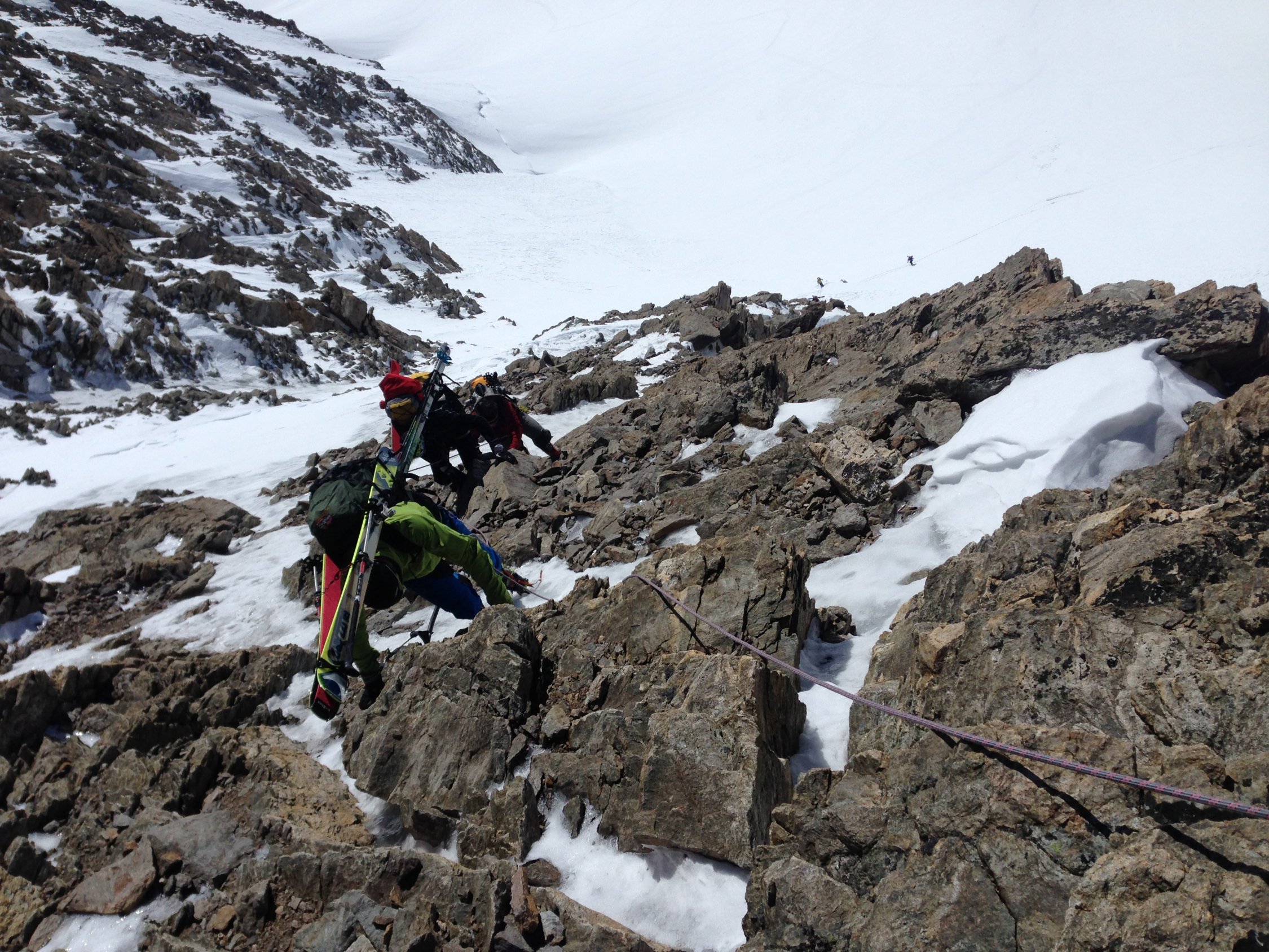 Das Ewigschneefeld ist hart wie eine Piste - super zum hinunterbrettern. Aufstieg immer Angeseilt. Aufstieg zum Fieschersattel guter Trittschnee, ab der hälfte auf den Felssporn gewechselt. Grat zum Gross Fiescherhorn und Hinteres Fiescherhorn harter Schnee und trockener Fels - viele Stellen können einfach umgangen werden. Abfahrt zur Fiensteraarhornhütte bei Top Verhältnissen - teilweise aber Angeseilt abgefahren.
