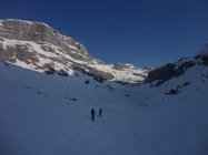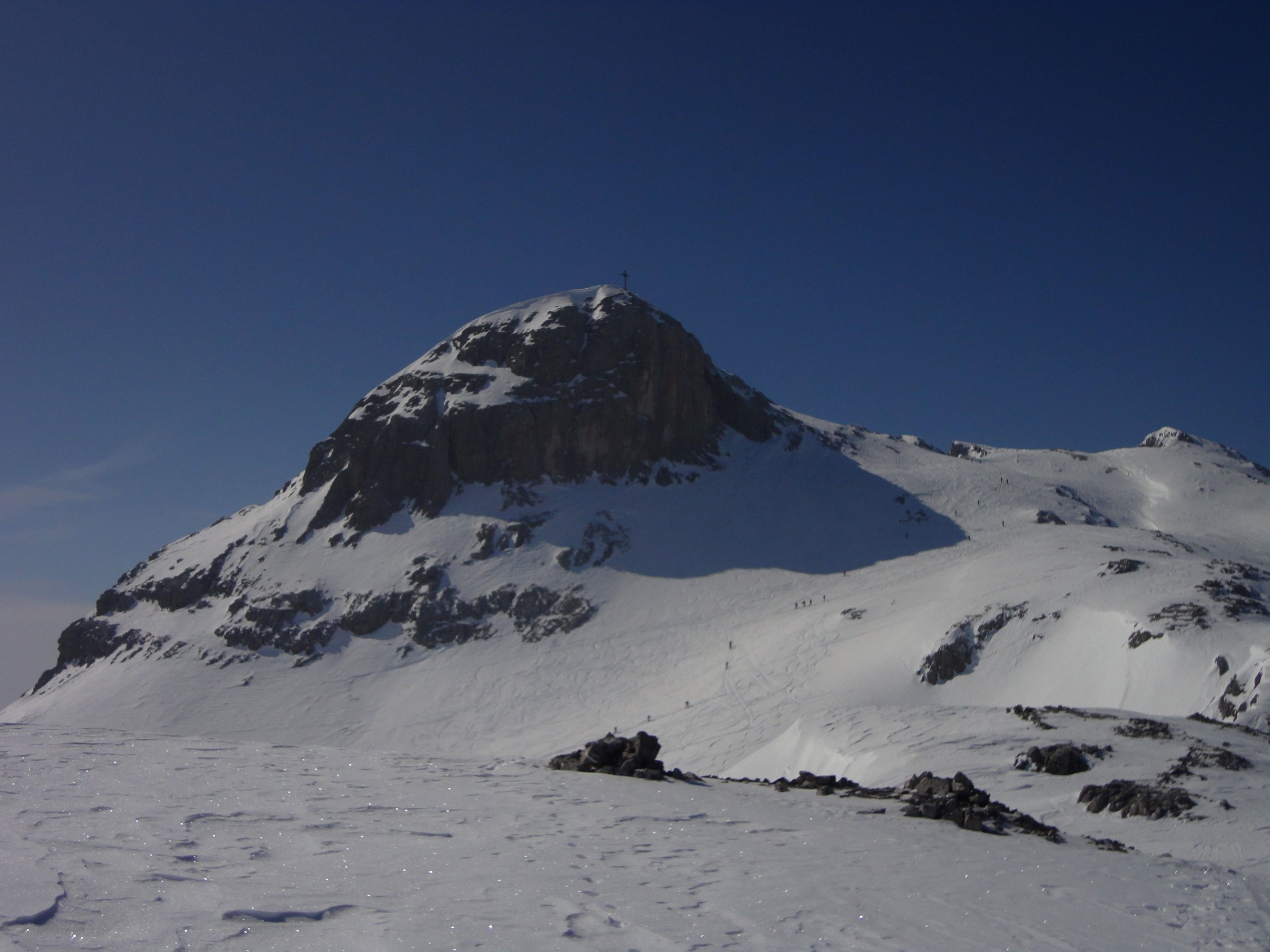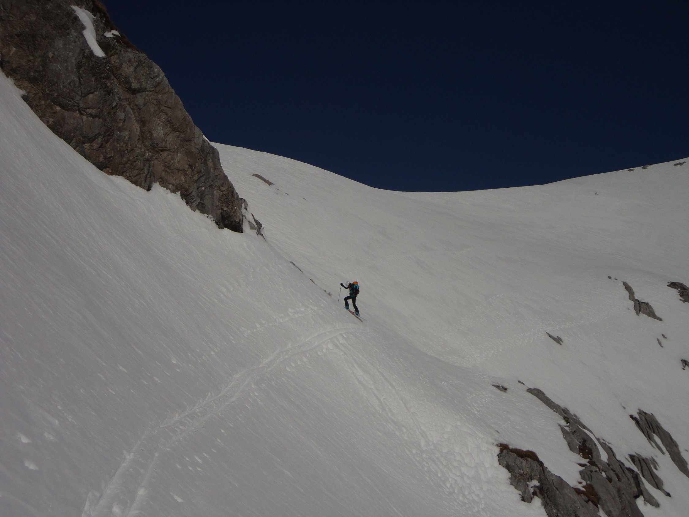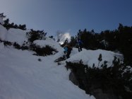 Abfahrt im Rachen noch immer Pulver, allerdings mittlerweile schon ziemlich zerfahren. Einige Schwünge in unverspurtem Pulver sind dazwischen jedoch immer noch möglich. Latschengürtel etwas mühsam, einige Meter Abstieg zu Fuss.