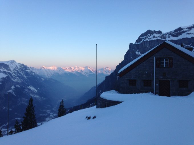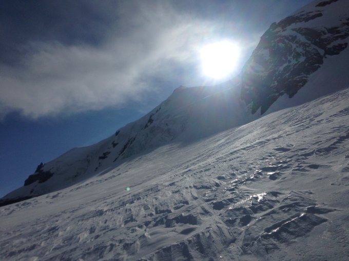 Das Couloir, welches zum Gletscherplateau führt hat wenig Schnee und wird nicht einfacher begehbar. Die Spaltensituation auf dem Gletscher wird sich auch weiter verschärfen, wenn es nicht noch eine Ladung Frühlingsschnee gibt.