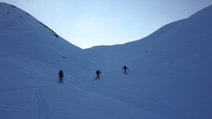 Austieg kein problem mit pulvrig, Grat 2700-2750m.u.m., fur uns skitrage, aber Abstieg Sudseite direct von gipfel. Start etwa h.12,00 mit gut Simil-Firn, die lezte 200m ab etwa 2200m.u.m. wenig schnee aber noch gut ski. Wetter gut in Morgen, bewölkt nachmittag