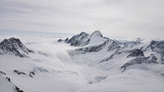 Die Gletscher scheinen gut eingeschneit zu sein und die Decke stabil. Aber das täuscht, besondere Vorsicht ist auf dem Hengsterengletscher (zw. Wellhornsattel und Wetterhorn) geboten. Dort hing ich bei einem Zwischenhalt auf der Abfahrt mit einem Bein in einem 5m-Spalt.
