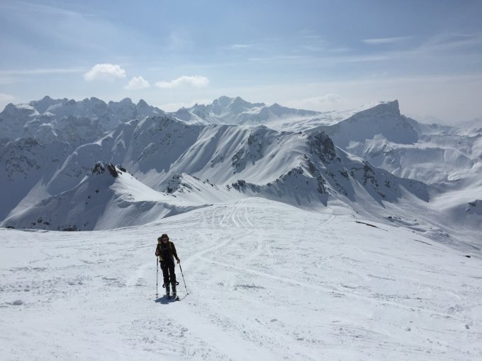 Windstill und herrliche Sicht am Gipfel. Vom Riedchopf das Tälli hinab pistenmässig niedergewalzt. In den Nord-Ost Hängen der Rotspitz der Schnee noch erfreulich ungebunden.