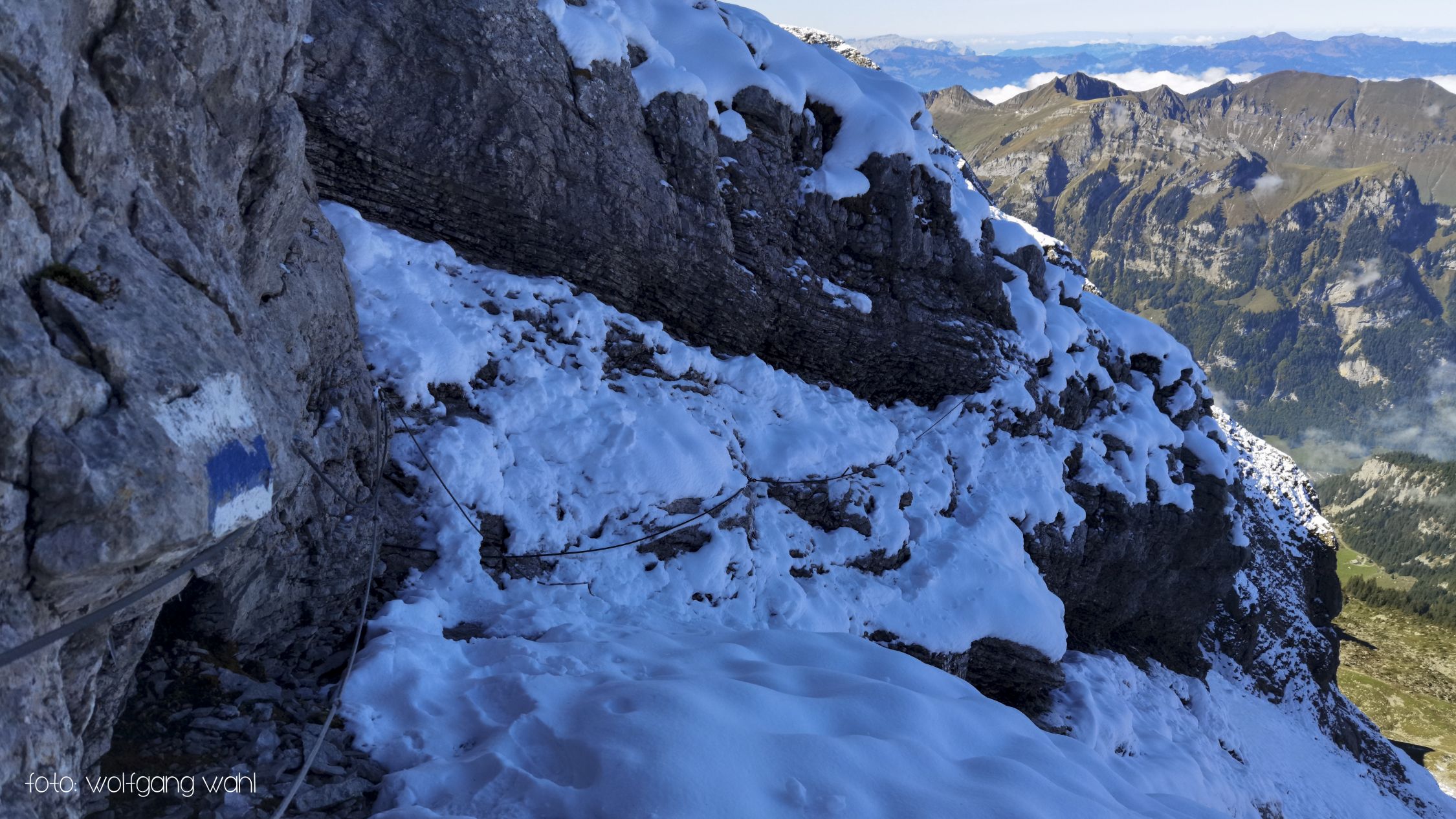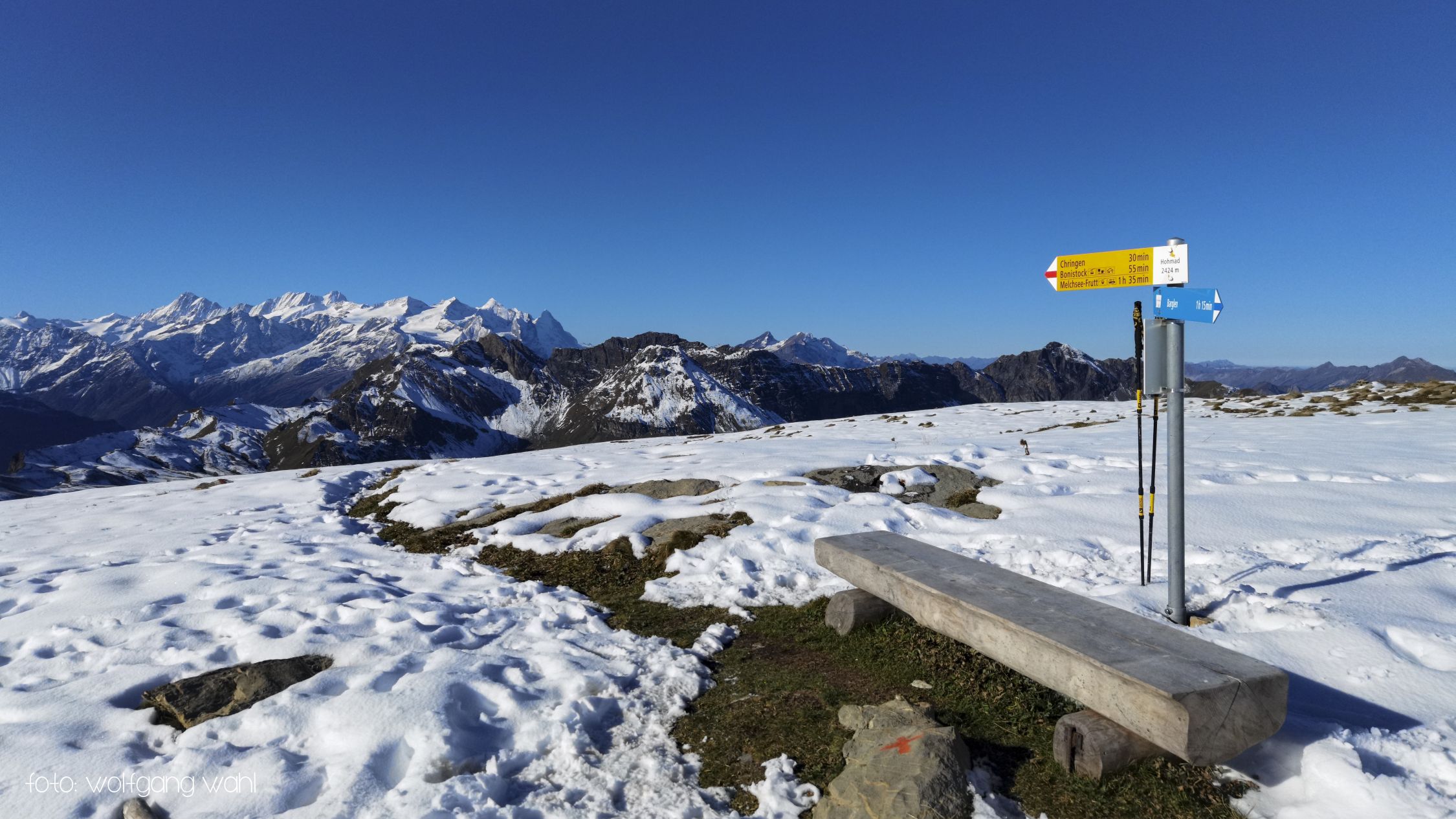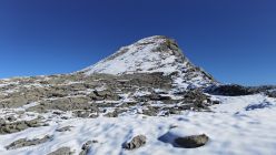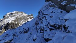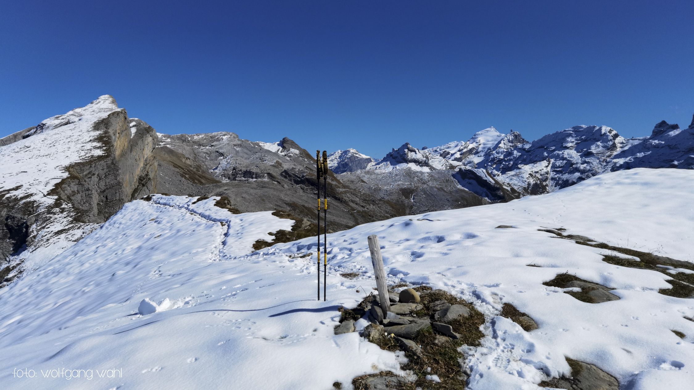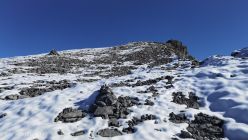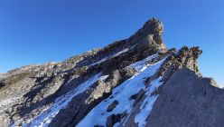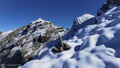 Ab Chringen ist der Bergpfad zum Barglen weiss-blau-weiss markiert und führt erst trocken über Grashänge hoch zum Hohmad 2’424m und über Schneefelder weiter zu P2442 wo man auf P2413 abklettert. Die Kletterstellen sind schneefrei und teils mit Stahlseilen gesichert, der kurze ungesicherte Abstieg in die Nordflanke ist eingeschneit und rutschig. Weiter richtung Chli Hohmad, steigt man auf 2’400m richtung Norden, den Steinmännchen folgend, im Tiefschnee richtung Norden ab und quert die Nordflanke des Chli Hohmad. Markierungen sind grösstenteils eingeschneit, man muss den Steinmännchen folgen, welche zu einer eingeschneiten und vereisten, mit Drahtseilen gesicherten Traverse führen, das heisst jetzt hat es ja Spuren welchen man folgen kann. Einige Drahtseile sind mit einer schwarzen Kunsstoffhülle versehen und sind deshalb nicht gut griffig. Ab P2432 sind wieder Markierungen und sehr viele grosse Steinmänner gut zu erkennen und weisen den Weg meist trocken, teils über gut gehbare Schneefelder zum Gipfel des Barglen Schiben 2’669m. Der Schnee ist aufgrund der Bise und den tiefen Temperaturen hart und wird auch gegen Mittag nicht weich.