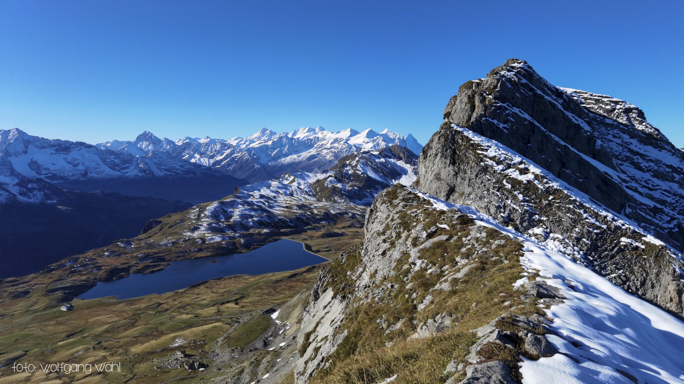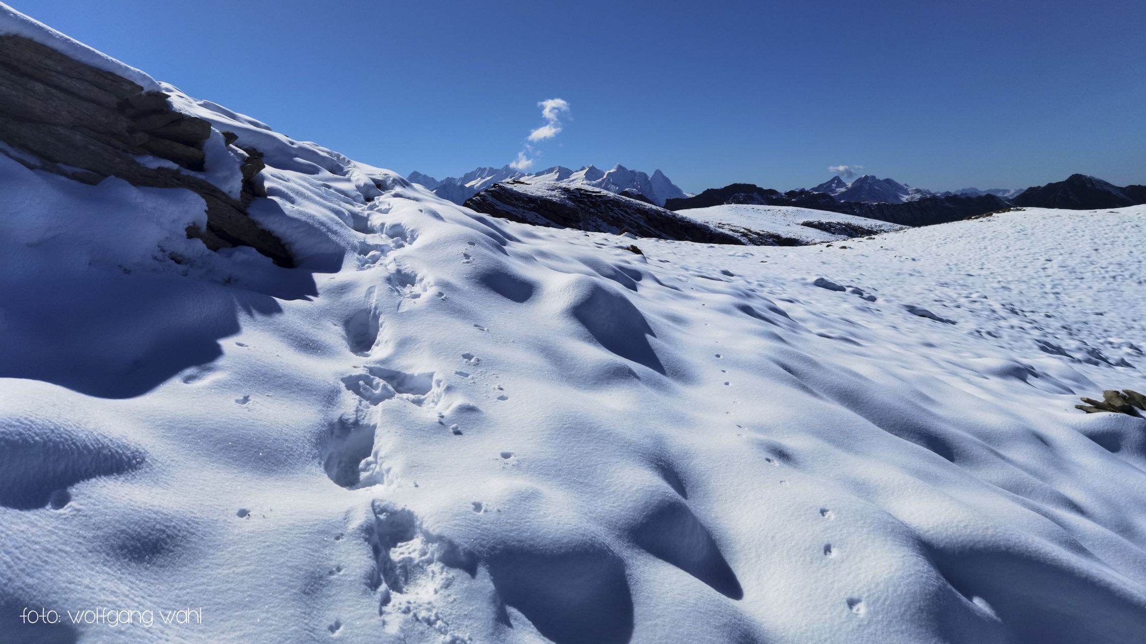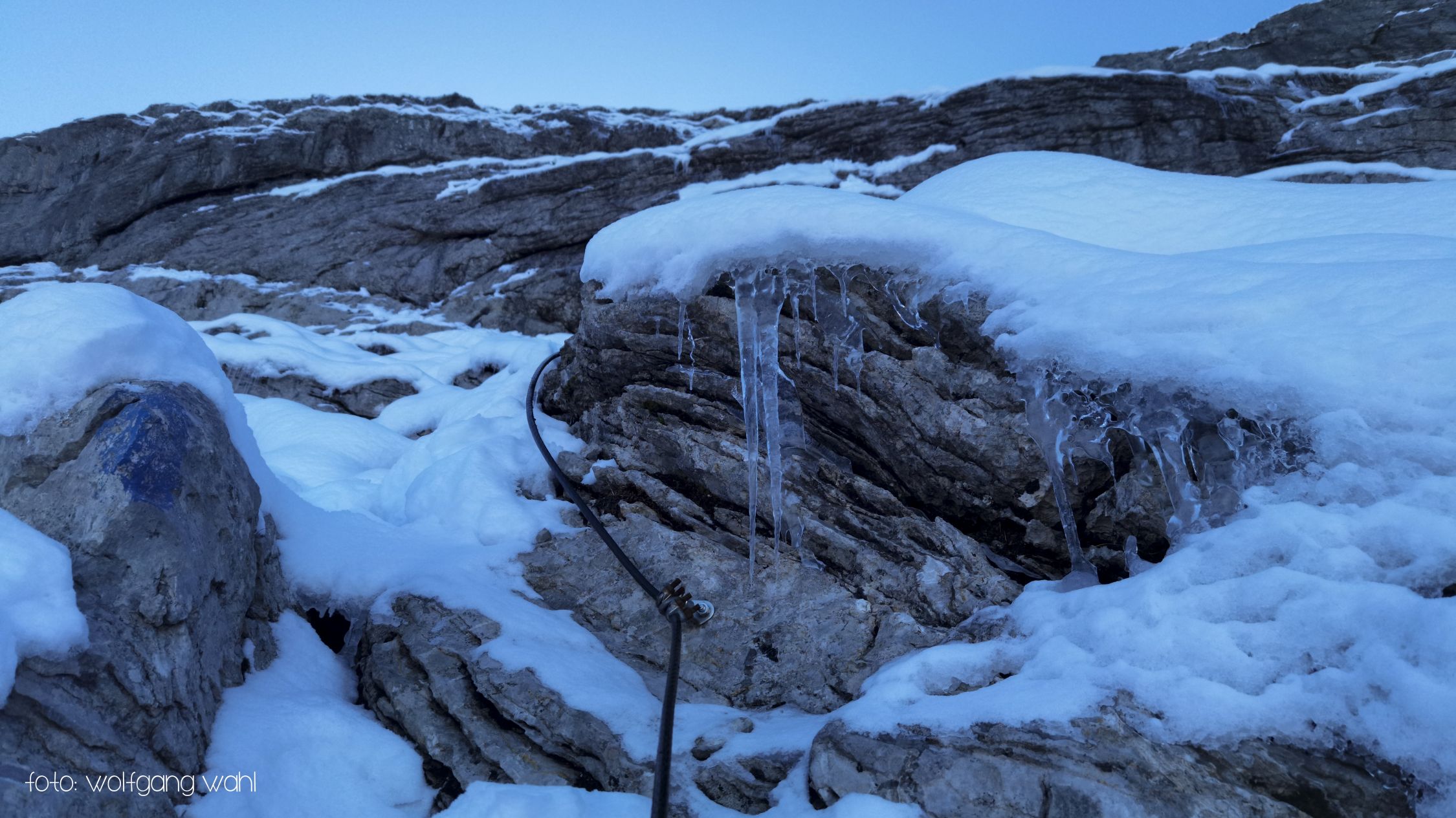 Ab Chringen ist der Bergpfad zum Barglen weiss-blau-weiss markiert und führt erst trocken über Grashänge hoch zum Hohmad 2’424m und über Schneefelder weiter zu P2442 wo man auf P2413 abklettert. Die Kletterstellen sind schneefrei und teils mit Stahlseilen gesichert, der kurze ungesicherte Abstieg in die Nordflanke ist eingeschneit und rutschig. Weiter richtung Chli Hohmad, steigt man auf 2’400m richtung Norden, den Steinmännchen folgend, im Tiefschnee richtung Norden ab und quert die Nordflanke des Chli Hohmad. Markierungen sind grösstenteils eingeschneit, man muss den Steinmännchen folgen, welche zu einer eingeschneiten und vereisten, mit Drahtseilen gesicherten Traverse führen, das heisst jetzt hat es ja Spuren welchen man folgen kann. Einige Drahtseile sind mit einer schwarzen Kunsstoffhülle versehen und sind deshalb nicht gut griffig. Ab P2432 sind wieder Markierungen und sehr viele grosse Steinmänner gut zu erkennen und weisen den Weg meist trocken, teils über gut gehbare Schneefelder zum Gipfel des Barglen Schiben 2’669m. Der Schnee ist aufgrund der Bise und den tiefen Temperaturen hart und wird auch gegen Mittag nicht weich.