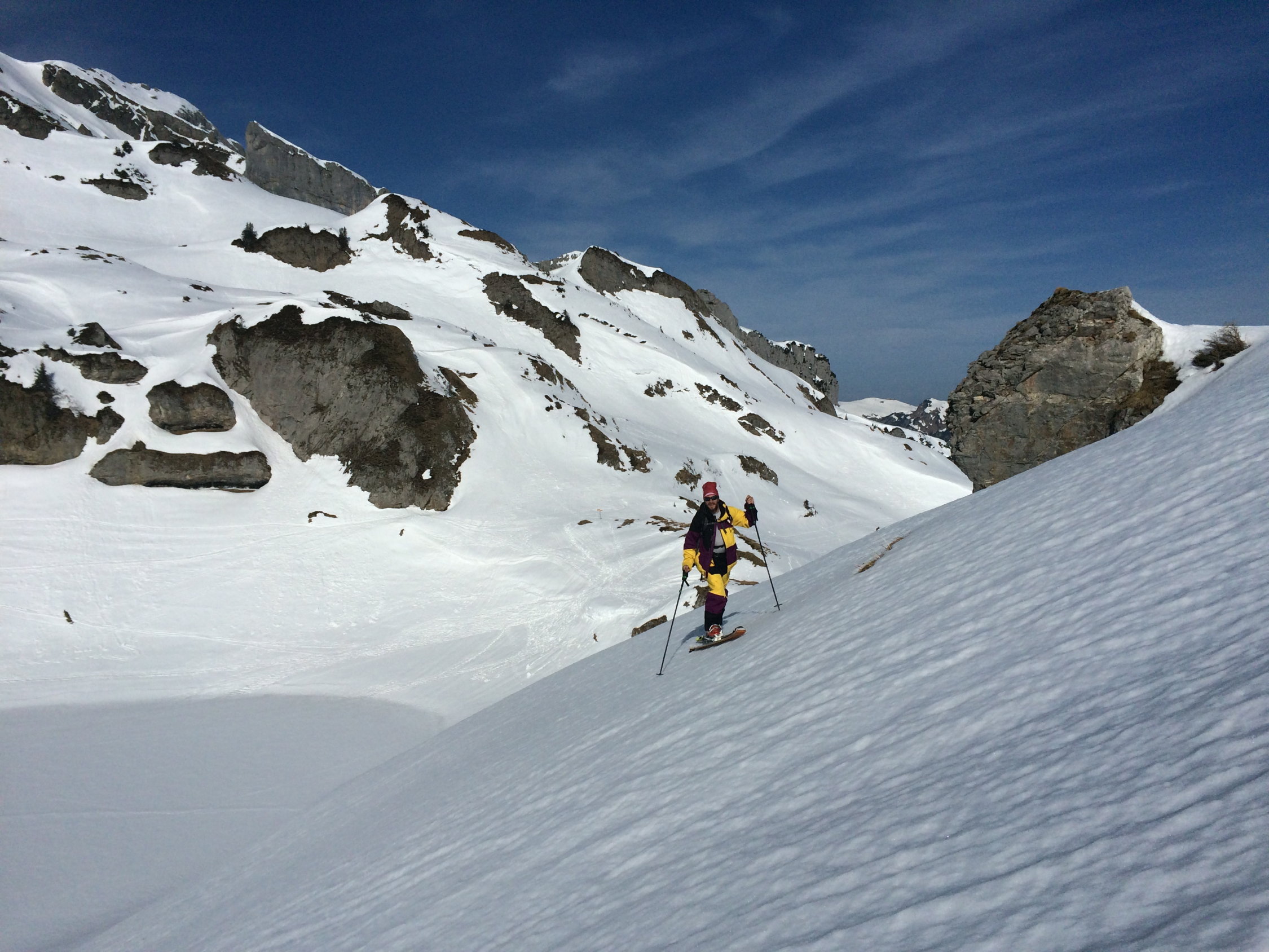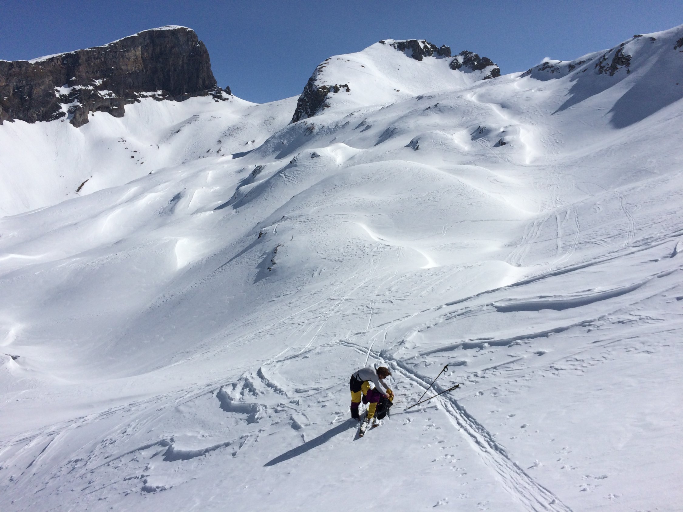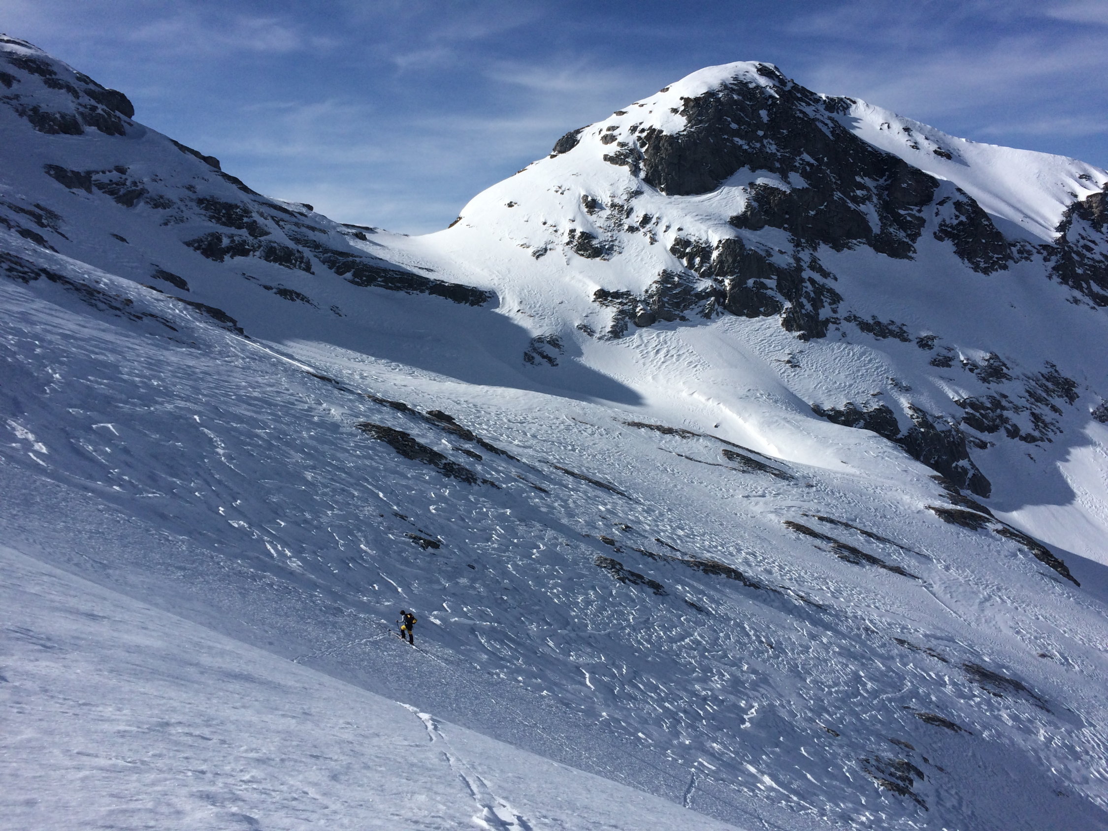 Genug Schnee im Gebiet. Leider recht windgepresst. Ein paar wenige Meter schwerer Restpulverschnee in steilen Nordabfahrten gefunden. Sonst von allem etwas. Aufstiege zu den Gipfeln sind momentan problemlos machbar und gut gespurt. Nur am Morgen noch recht hart, weshalb ggf. Harscheisen nützlich sind. Ging heute aber auch ohne ganz gut.