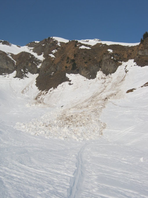 Abfahrt: Na ja. Gut, wenn man nicht mit hochfliegenden Erwartungen auf den Berg geht. Der oberste Hang liess sogar noch ein paar Pulver-Schwünge zu. Dann sind wir auf die Wyss-Rössli-Seite (Südost-Hang) gequert, wo es feinen Sulz gab. Schon eher etwas weich, dies kurz nach 9 Uhr!! Ab Alp Fluebrig dann ein "Misch-Masch": leicht verdeckelt, 10 cm vom feinsten Nassschnee, ganz unten wie üblich etwas verfahren.