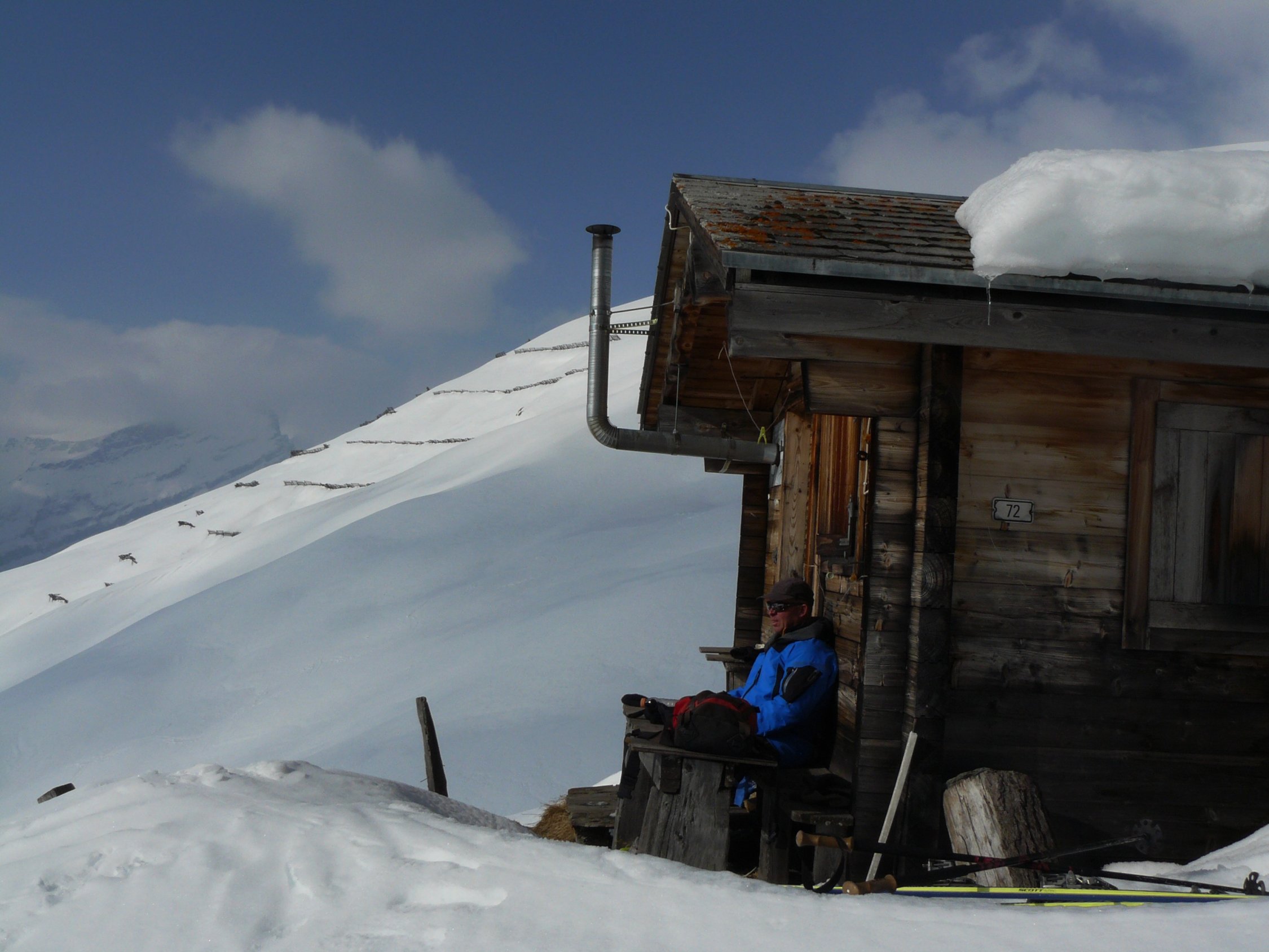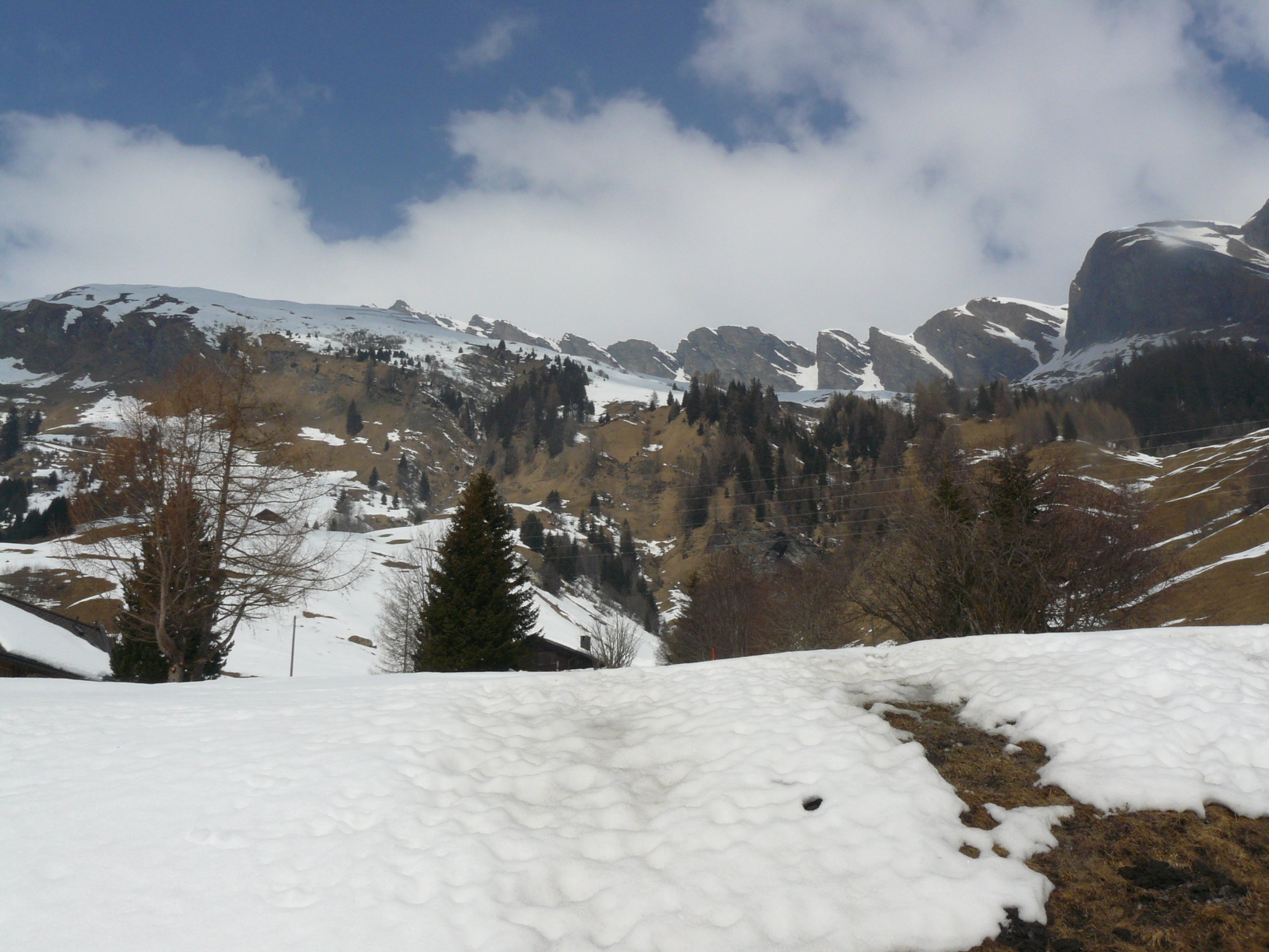 Durch Südlage ausgezeichneter Sulz bis ins Dorf, zuunterst gerade noch genug Schnee, wechselnd bewölkt, oben Bise.
