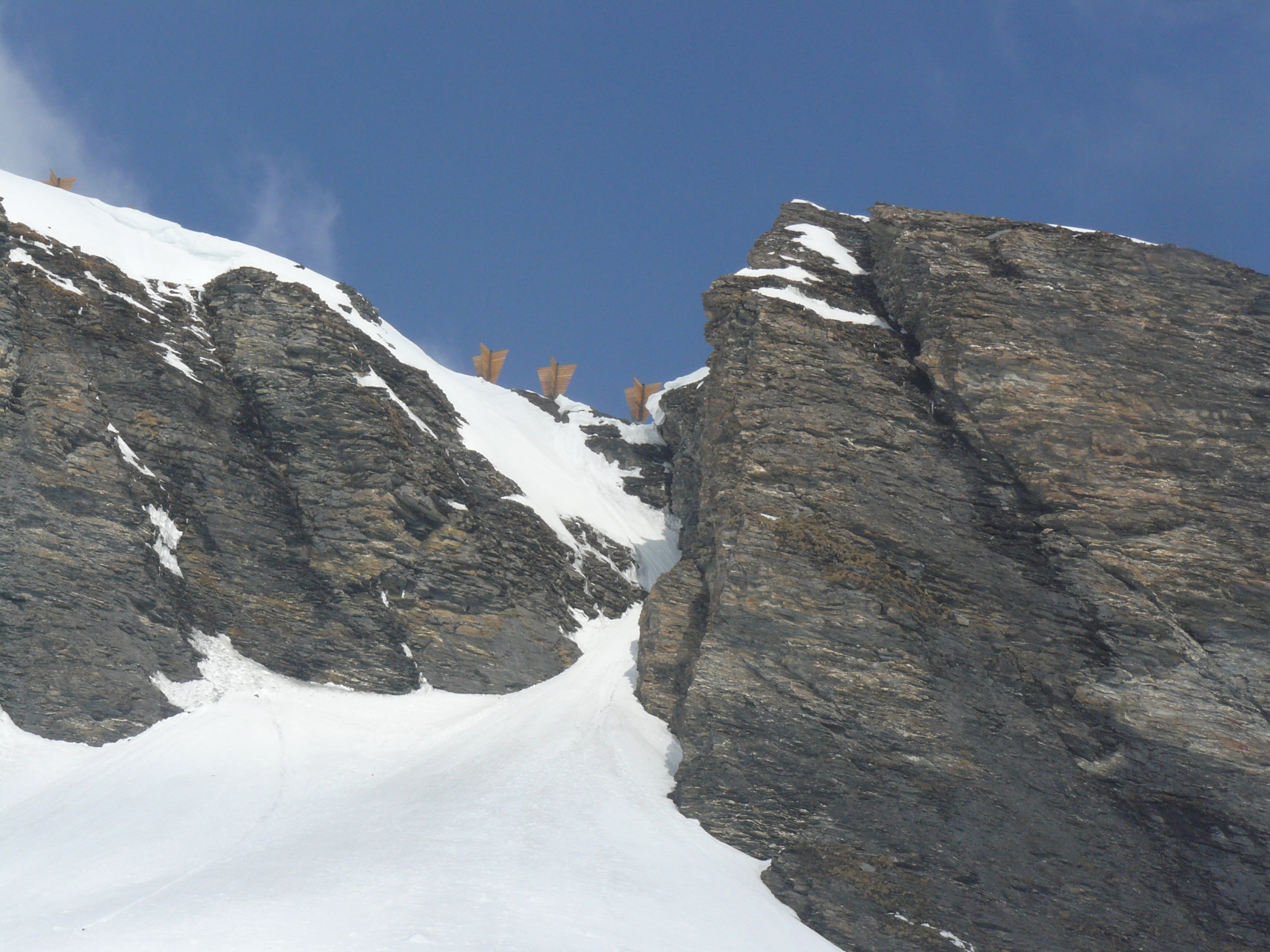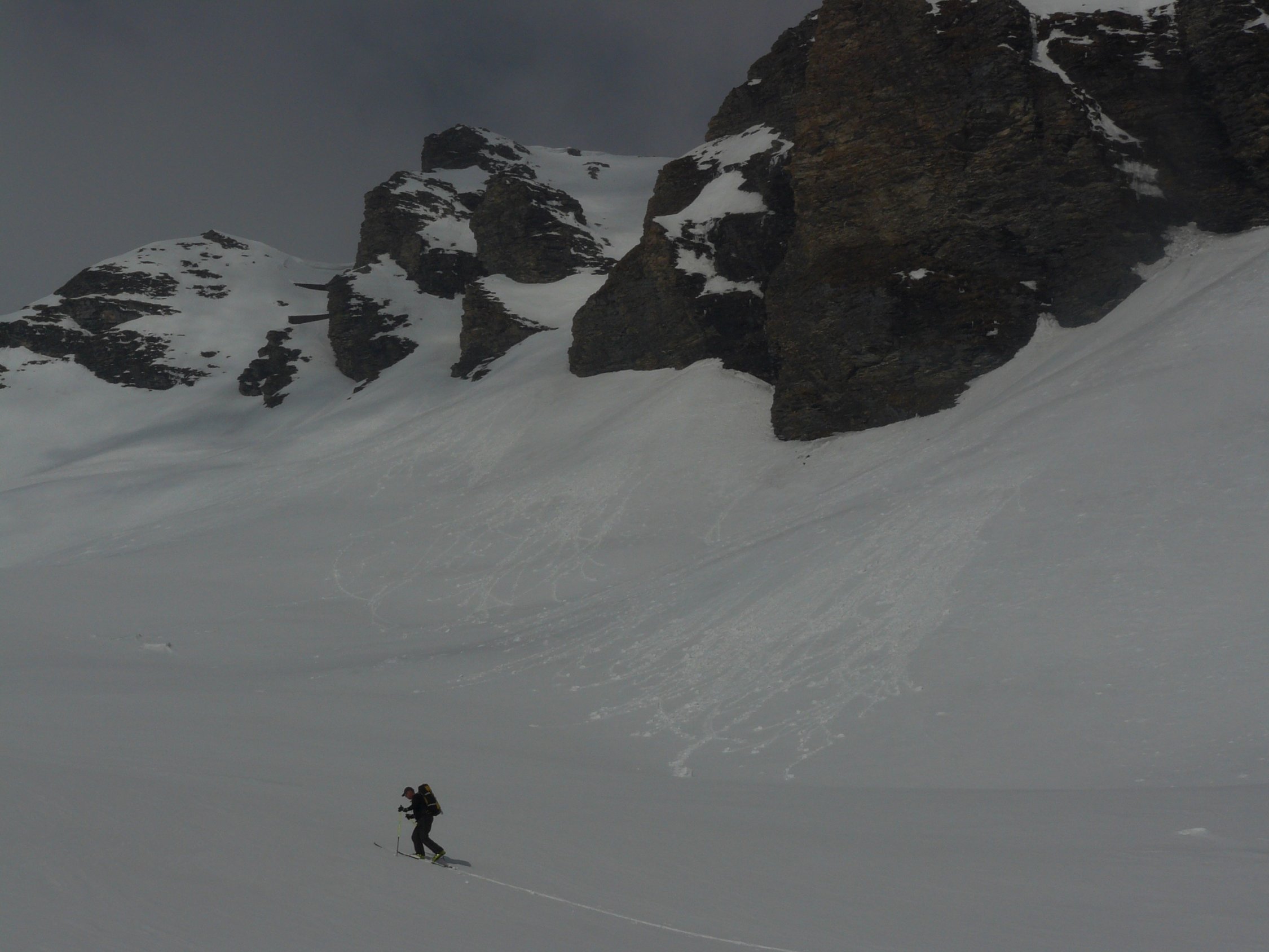 Steiler Gipfelhang um 10 Uhr schon recht tief, daher aus Sicherheitsgründen heute Gipfelverzicht. Um so mehr Genuss des Firns!
