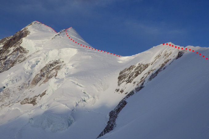 Der Mittelaletschgletscher ist gut eingeschneit (auf der Route keine Spalten sichtbar). In der Flanke zwischen Aletschjoch und Punkt 3718 durchgehend Schnee (wir blieben in der Flanke und betraten den Grat erst nach Punkt 3718). Auf dem Rücken zum Vorgipfel z.T. viel Neuschnee (Verwehungen). Um die steile Flanke zu meiden, gingen wir nach dem Bergschrund zu den Felsen links und stiegen zu Fuss am Rand der Felsen bis auf die Rippe, die in ostnordöstlicher Richtung vom Vorgipfel hinunterführt (siehe Route auf dem ersten Foto). Auf der Südflanke dieser Rippe griffiger Schnee bis zum Vorgipfel. Der Nordwestgrat des Hauptgipfels ist gut eingeschneit, nur ein paar Stellen mit Felskontakt und wenig Eis.