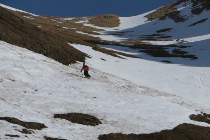Schnee reicht gerade noch bis zur Talstation der Bahn nach Gamplüt. Der Durchstieg zur Südwestrinne ist teilweise schneefrei, das Couloir aber mit Lawinenschnee gefüllt. Oben teilweise Unterbrechungen in der Schneedecke, ab Mietplätz tip top. Aktuell keine neuen Nassschneerutsche.