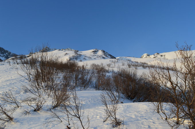 Gipfelaufstieg: Nord dick mit Schnee zugedeckt. Zur Zeit kann gut in der N-Flanke unter den Gipfel gequert und dann direkt aufgestiegen werden. In der Abfahrt durch die Nordwestflanke, Vorsicht vor Steinkontakt. Schneemenge ist da eher knapp.