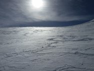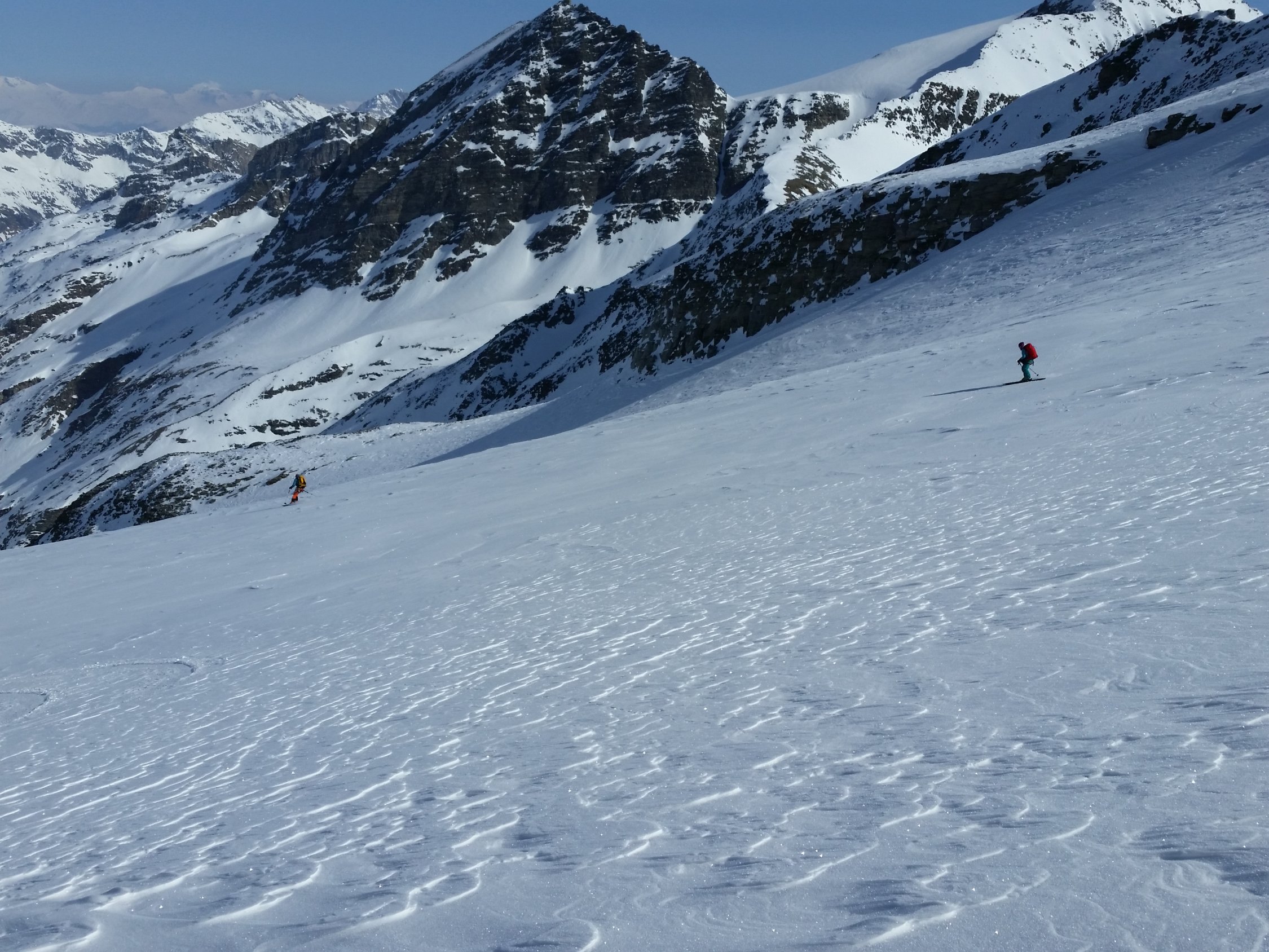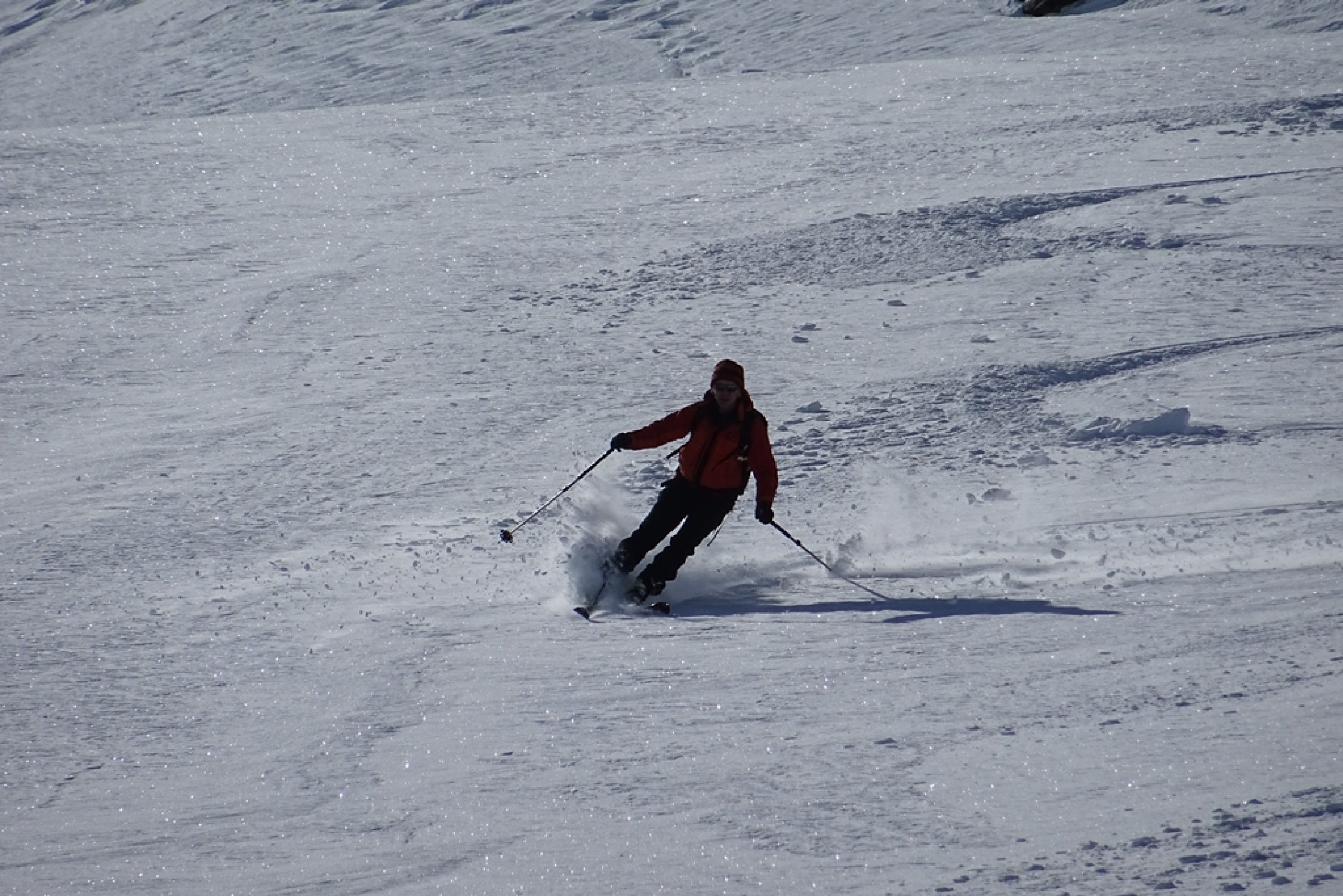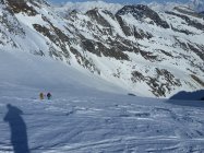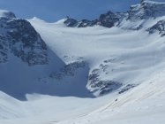 Auf der gesamten Route gute bis sehr gute Verhältnisse in Aufstieg und Abfahrt. Die gut angelegte Aufstiegspur war im Mittelteil recht glatt, sodass eine eigene Spur oft angenehmer war. Allenfalls Harscheisen von Vorteil, aber nicht unbedingt nötig. Keine Spalten sichtbar. In der Abfahrt gegen 10:30 Uhr teils Pulver, teils Windpress, teils Firn, auch im unteren Teil noch tragend (trotz wolkenlosem Wetter nur geringe Erwärmung - Sonnenfinsternis?). Unterhalb der Läntahütte lange flache Schiebestrecken, aber um 12 Uhr noch ohne Einbrechen. Heute nur insgesamt 3 Personen unterwegs.