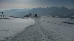 Die Naturpiste (Talabfahrt) von Caischavedra war oben gesperrt und wurde nicht mehr gewalzt, da ab P 1597 runterwärts schneefreie Stellen auf dem Fahrweg zunahmen. Die Abkürzer sind aber noch mit ausreichend Schnee beschickt, wenn auch abgefahren.
