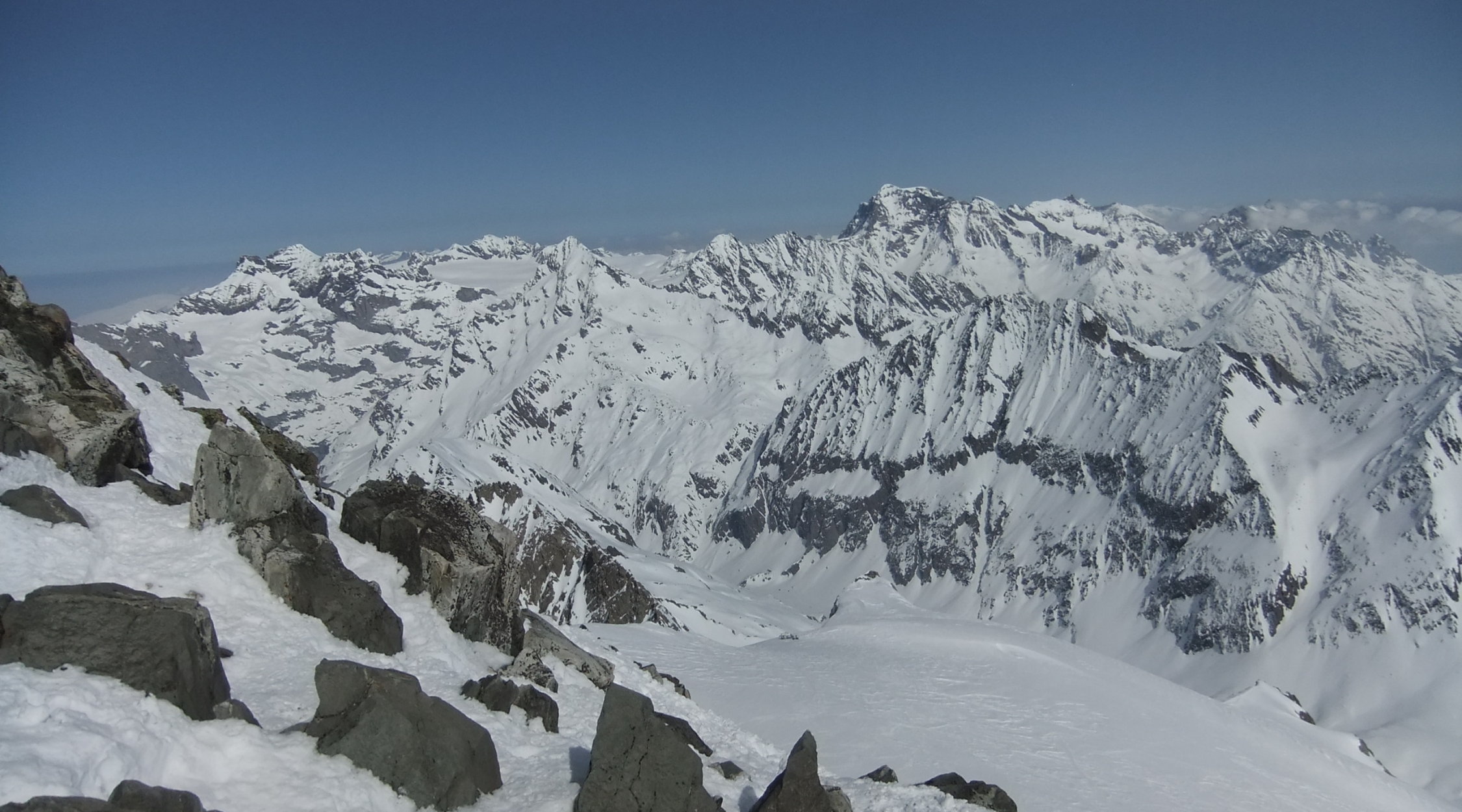 Ab der Felslücke bieten sich einem jedoch atemberaubende Ansichten in unberührte Natur. Vom Gipfel blickt man auf die Südwestseite vom nahen Tödi und rechts von ihm im Osten auf den P. Avat. Nach Norden zu den Urner Alpen mit Windgällen u. Ruchen. Im Westen zum Titlis u. das Sustenhorn und links davon den Dammastock. Im Süden P. Gannaretsch u. links P. Medel.