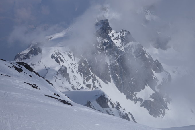 Wir sind vom Gipfel kurz nach NE abgefahren und auf 2880 ca 0.5 km nach W auf den Glatt Firn. Kurzer Gegenaufstieg über den Rücken WNW des Zwächten. Dann Abfahrt durch das steile S-Couloir bei besten Sulz-Verhältnissen (siehe Fotos).