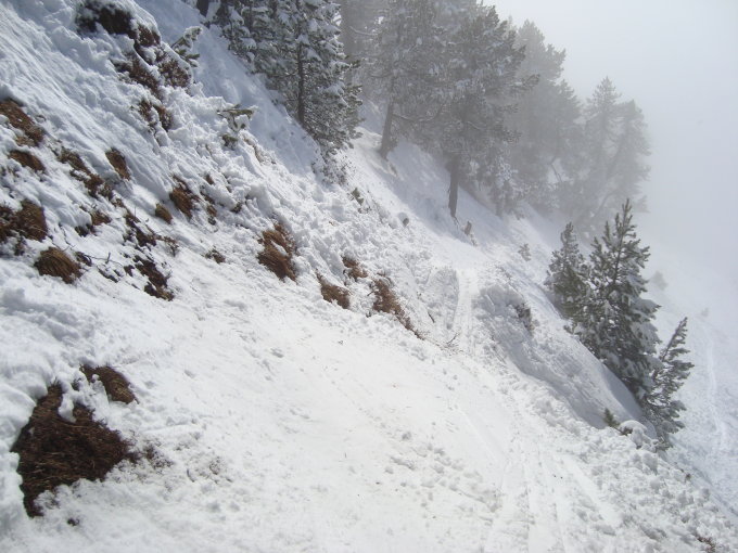 Der Neuschnee hat nur wenig Bindung auf der harschigen Altschneedecke. An der Steilstufe oberhalb von Jäntli einige kleinere Nassschneerutsche.