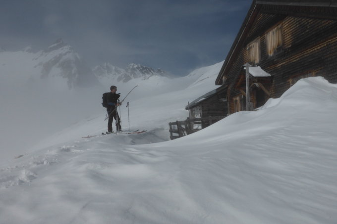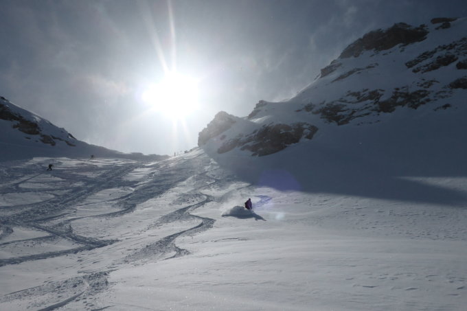 Vom Valenserberg 1300 müM bis Valpona 2000 müM feuchter Pulver, dann Pulver bis zum Gipfel ( bis 30 cm ) beim Rückweg unterhalb Valpona Nassschnee