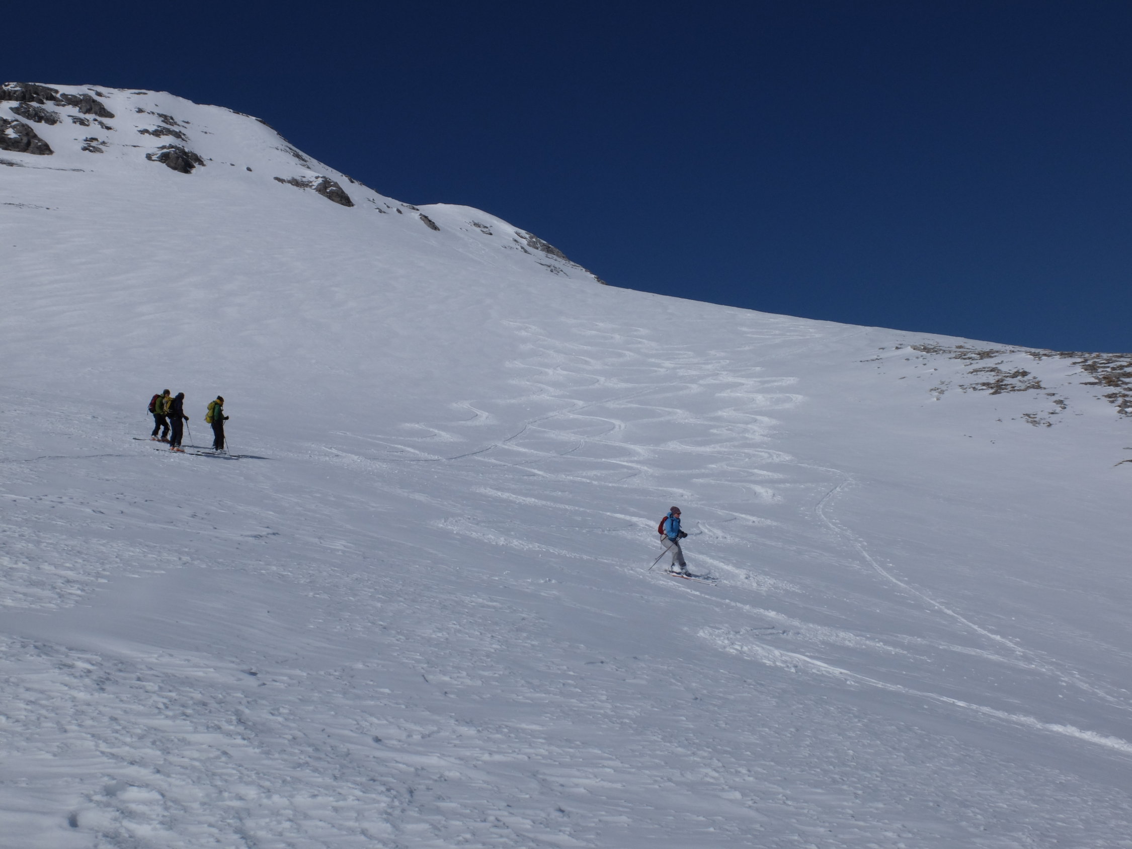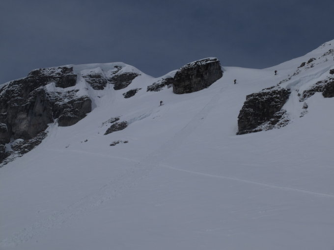 Unter Bützi auf etwa 2000m hat die Gruppe vor uns 3 Lockerschneerutsche ausgelöst (Breite 5-10m, Länge bis etwa 60m, Tiefe 10-15cm, 2 davon im Aufstieg und einen in der Abfahrt). Weiter haben wir 2 spontane Rutsche in diesem Bereich beobachtet (Breite bis 20m, Länge 100m, Tiefe 10-15cm). Mehrere neue Rutsche waren sichtbar bei der Abfahrt. Von Bützi haben wir einen bereits gefallenen Rutsch im Bereich Furggele gesehen, mit Ursprung in der O-Flanke von Höch Turm und Höhendifferenz etwa 250m.