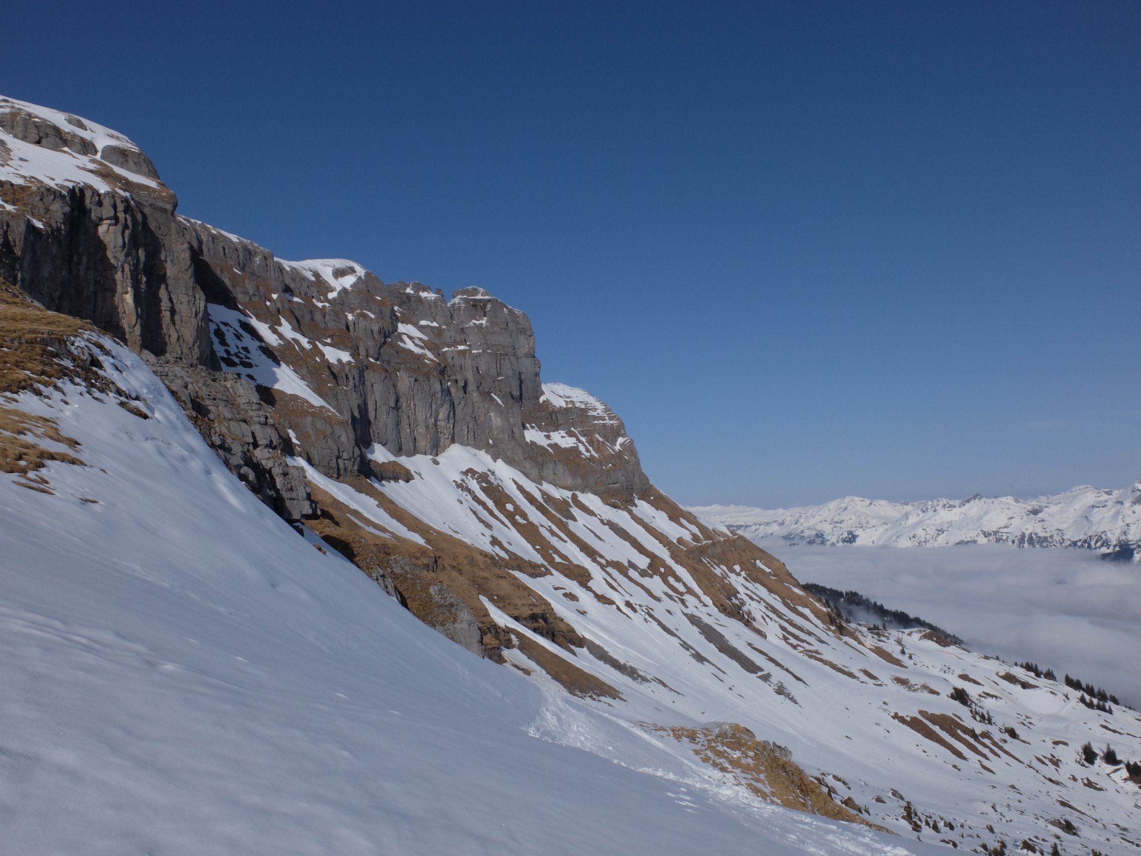 Eigentlich wollten wir auf Ortstock ursprünglich, aber der Furggele Aufstieg war uns zu heikel wegen dem Neuschnee auf harter Oberfläche. Somit war Grisset Ausweichsziel, der uns allerdings beste Abfahrt beschert hat. Abseits von Pisten waren wir nur mit einer anderen 3-köpfiger Gruppe unterwegs, somit war das Karstgelände schön einsam.