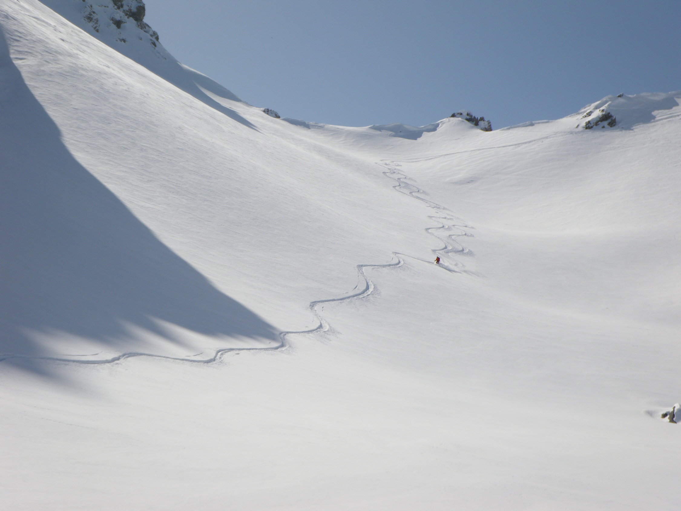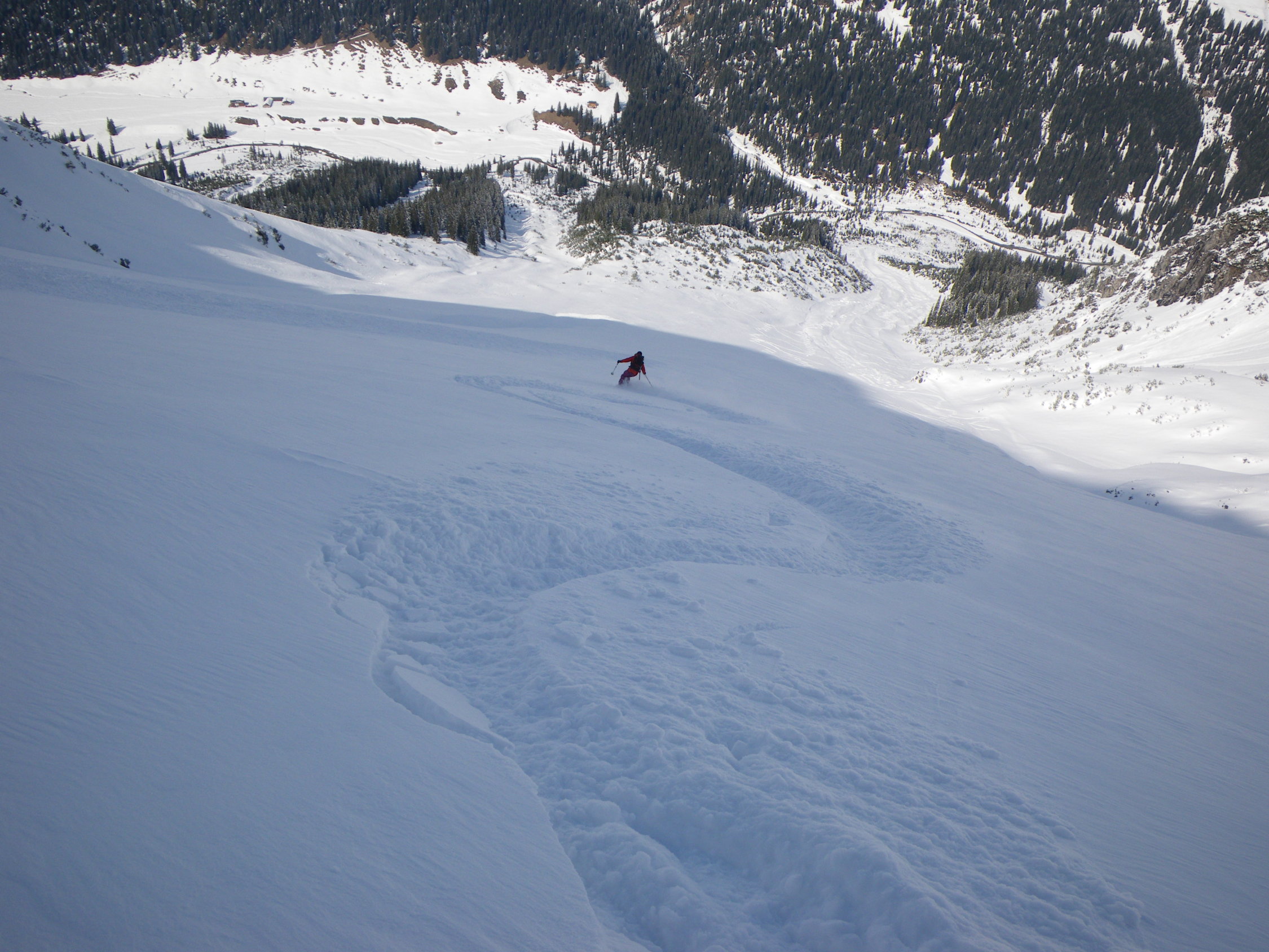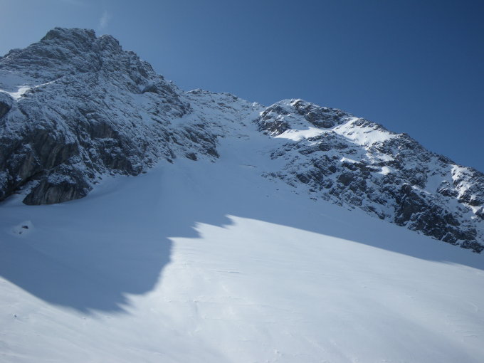 Heute waren wir die ersten am Gipfel und hatten einen super Abfahrtsgenuss im unverspurten Gelände. Bei richtiger Routenwahl auch Lawinentechnisch kein Problem.