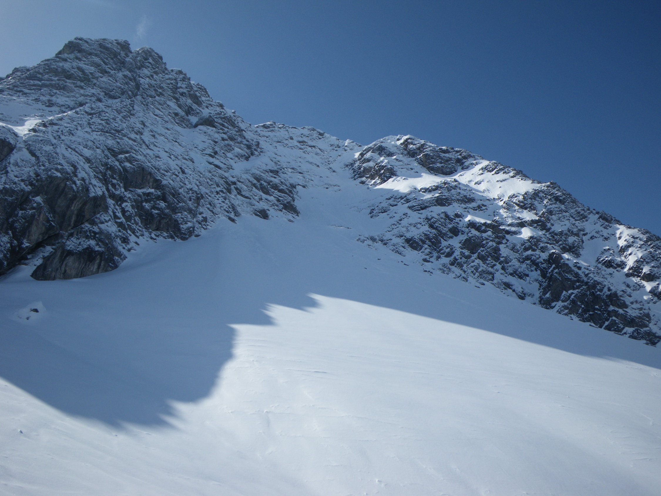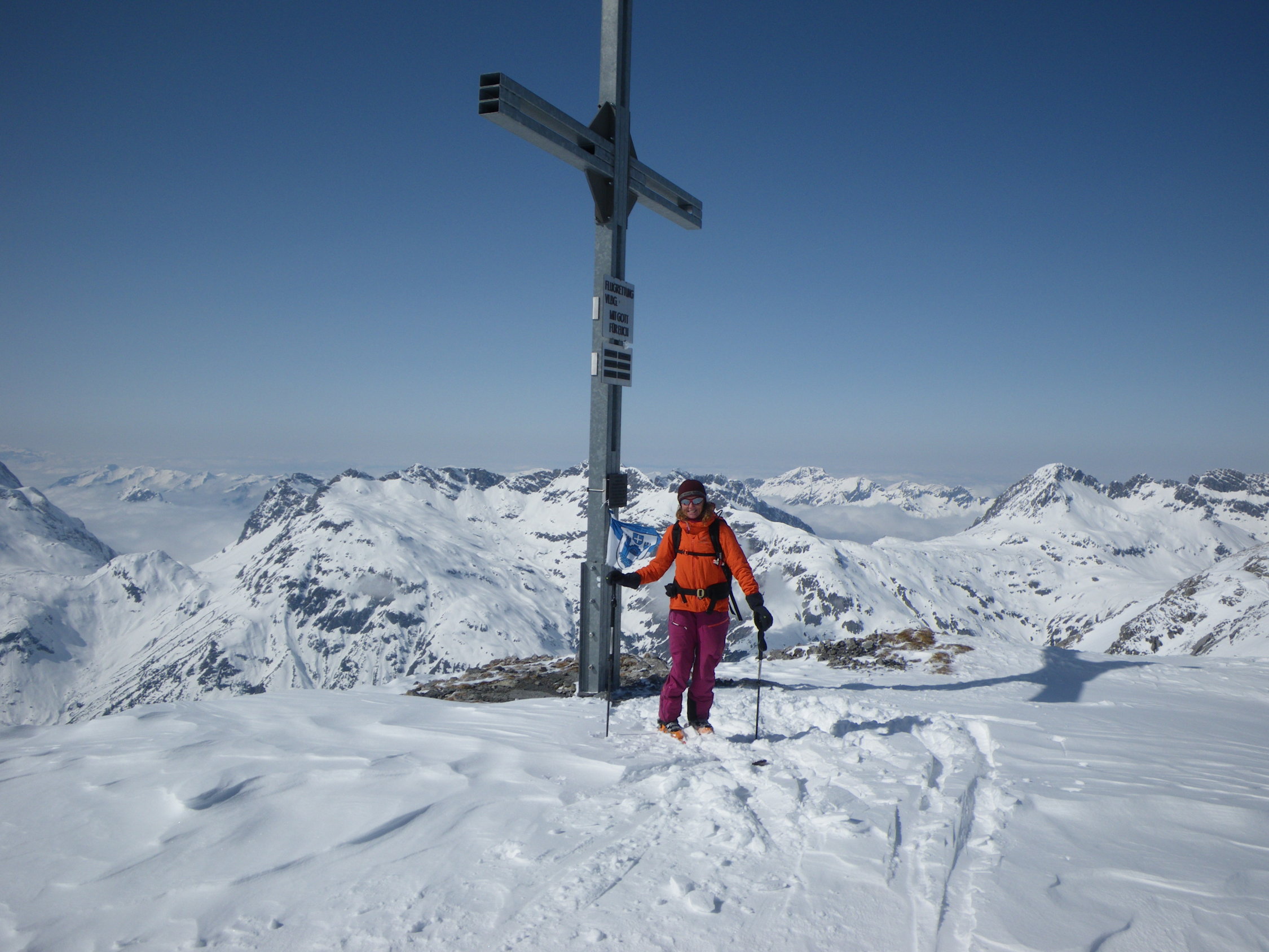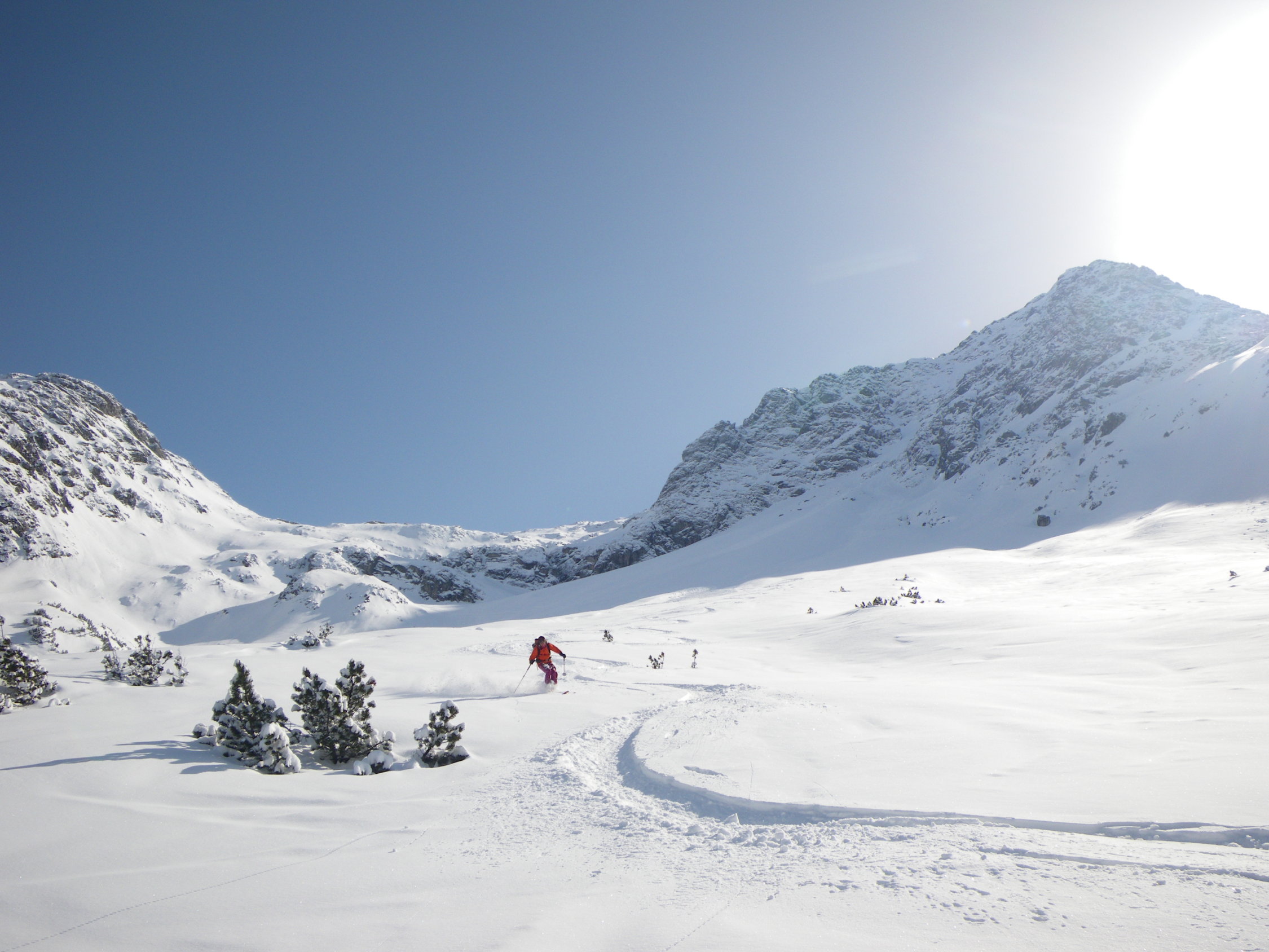 Heute waren wir die ersten am Gipfel und hatten einen super Abfahrtsgenuss im unverspurten Gelände. Bei richtiger Routenwahl auch Lawinentechnisch kein Problem.