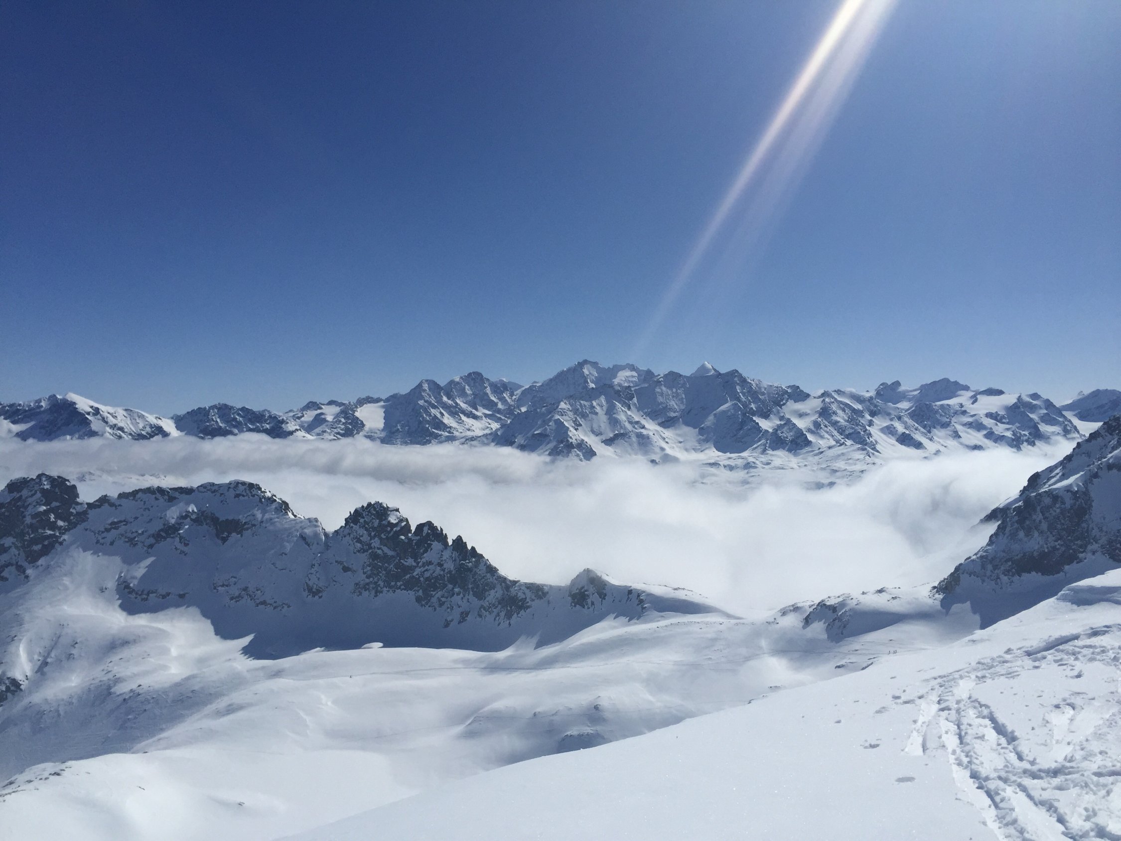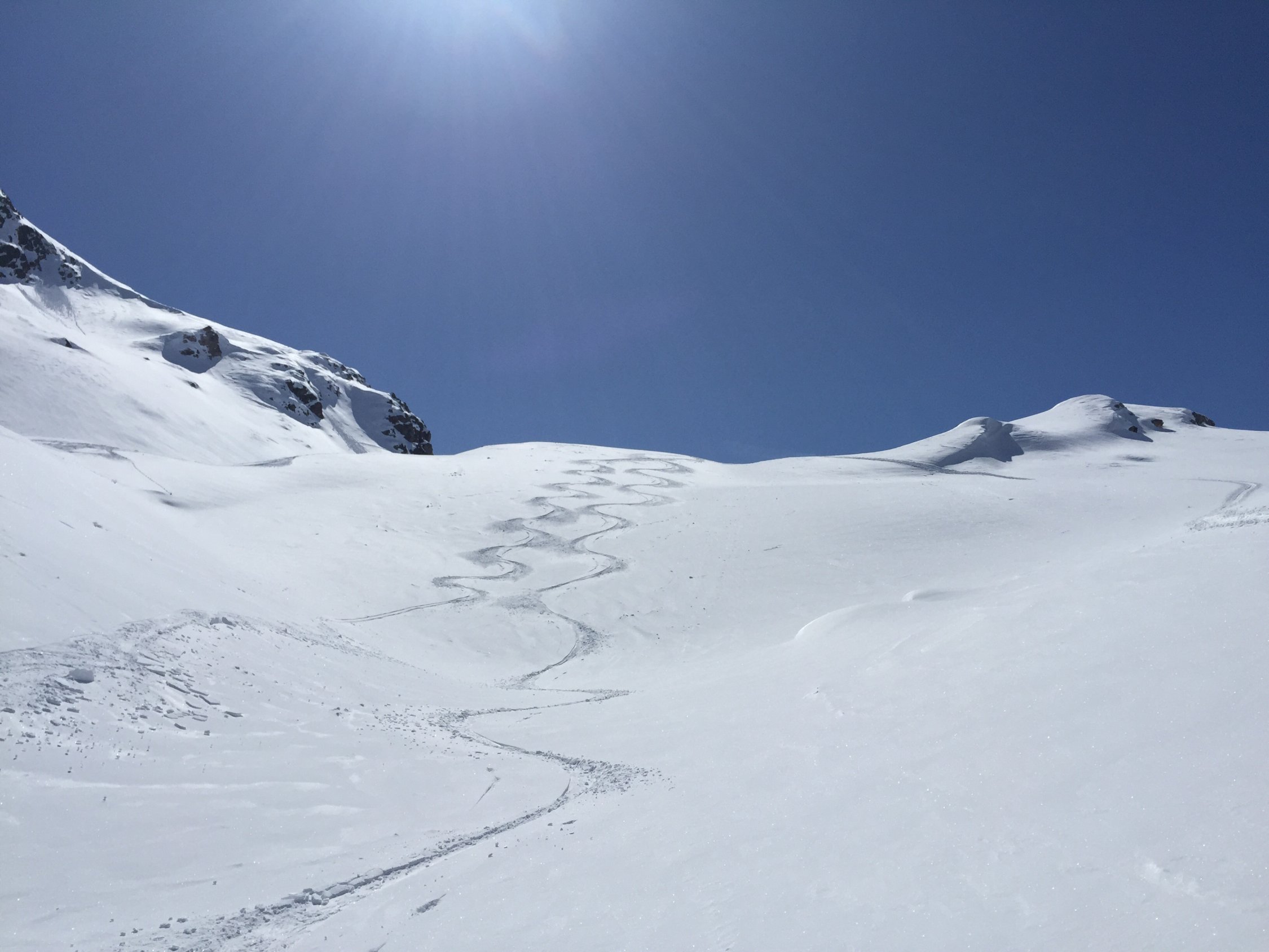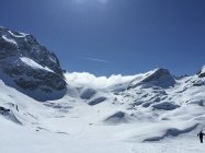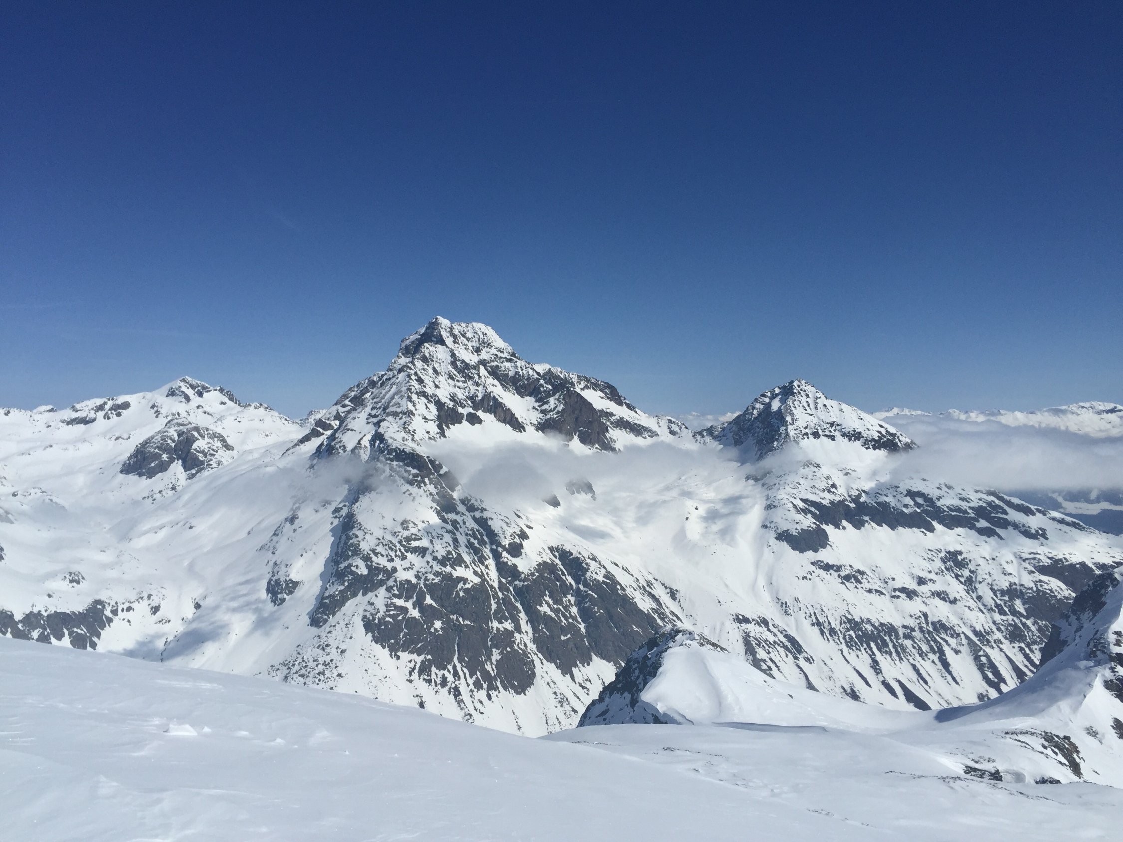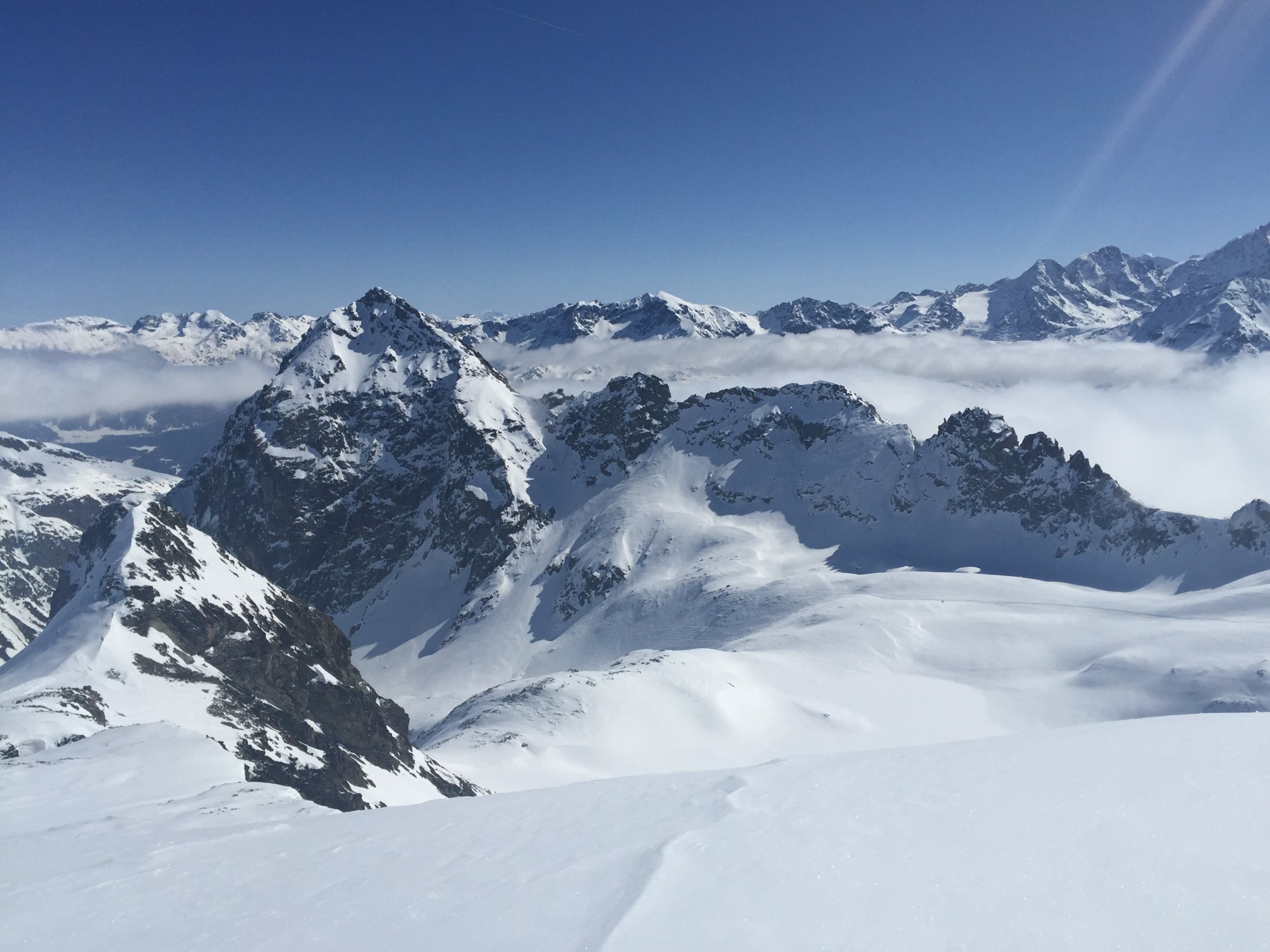 Sehr gute Verhältnisse, sowohl Wetter als auch Schnee. Sonne und viel Blau, wobei von Süden her immer wieder der Nebel drückte, aber nur bis zum Dadaint kam. Der Schnee war teils Pulver auf harter Unterlage, teils bereits firnig umgewandelt. Aufstieg von Veduta Hospiz problemlos, wir zogen es vor, statt der steilen Traverse mit hartem Schnee und Lawinenbollen von der Schulter ca 50 Meter abzufahren und dann weiter aufzusteigen. In der Flanke zweimal kurz ausgesetzt, sonst einfach. Der Gipfelhang wies ausgezeichnete Verhältnisse auf. Nach schöner Pause mit grandiosem Panorama folgte die sehr gute Abfahrt, teils im Pulver, teils im Firn. Ausser uns waren nur 2 Personen an dieser landschaftlilch wunderbaren und lohnenden Tour unterwegs. Dagegen ein ziemliches Ameisenrennen am Piz Dadaint, auch Lagrev wurde gemacht und sah gut aus. Ein Tourengänger ging auf den Piz Dadora, und die Fourcla zwischen Dadora und Dadaint wurde auch begangen.