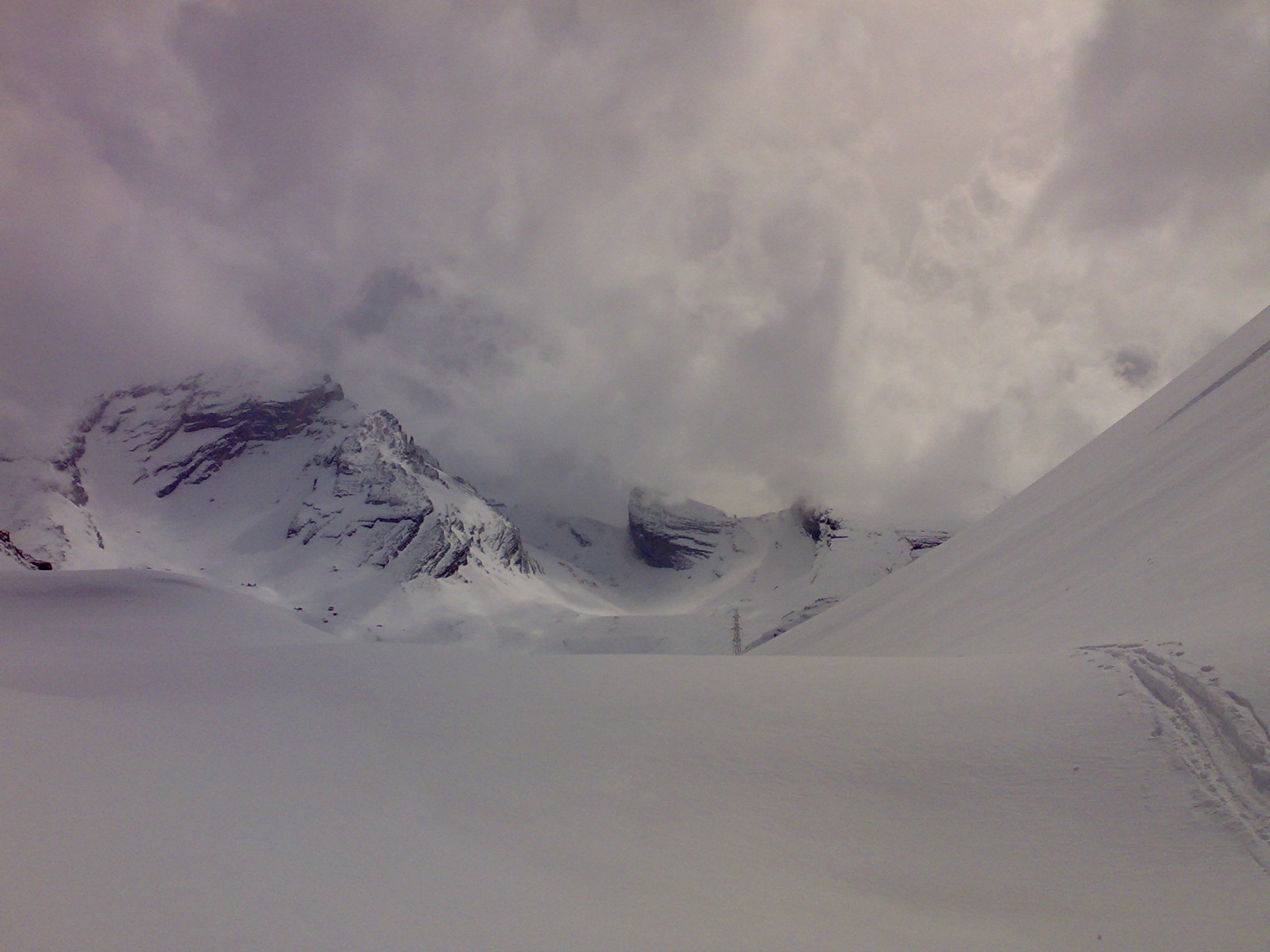 Ganze Tour gut eingeschneit. Abmarsch von der Spitelmatte im Schneefall welcher sich hartnäckig bis in den Graben zur Roten Kumme hielt. Ab hier einige sonnige Abschnitte, dafür auffrischender Wind. Bei der Traverse auf dem Band bei 2600 schon starker in der Gipfelregion stürmischer Wind aus süd- bis südwestlicher Richtung. Ich wollte eigentlich durch das Üschinental abfahren, der Wind war jedoch derart stark, das der Grat nicht zu überqueren war. Daher musste ich wieder dem Aufstiegsweg entlang abfahren. Verhätnisse: Teilweise blank gefegt oder Windharst, an windgeschützten Stellen lockerer Schnee von der letzten Nacht. Abfahrt vom Sunbühl nach Kandersteg völlig durchnässt vom Regen am Samstag, momentan nicht empfehlenswert.