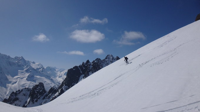 Abstieg gut sulz schnee bis Abnet etwa 1650m.u.m, dann skitrage bis passtrasse