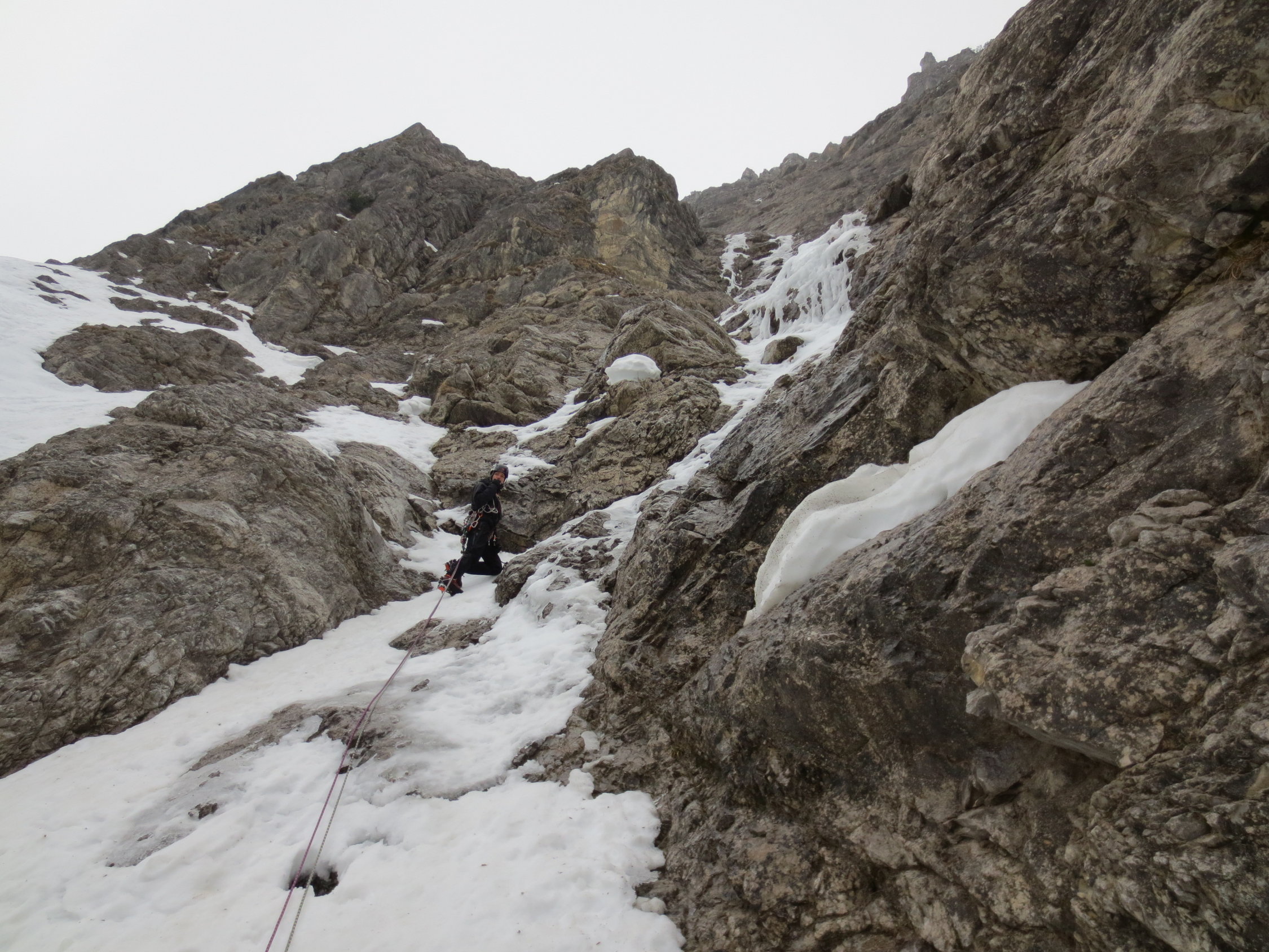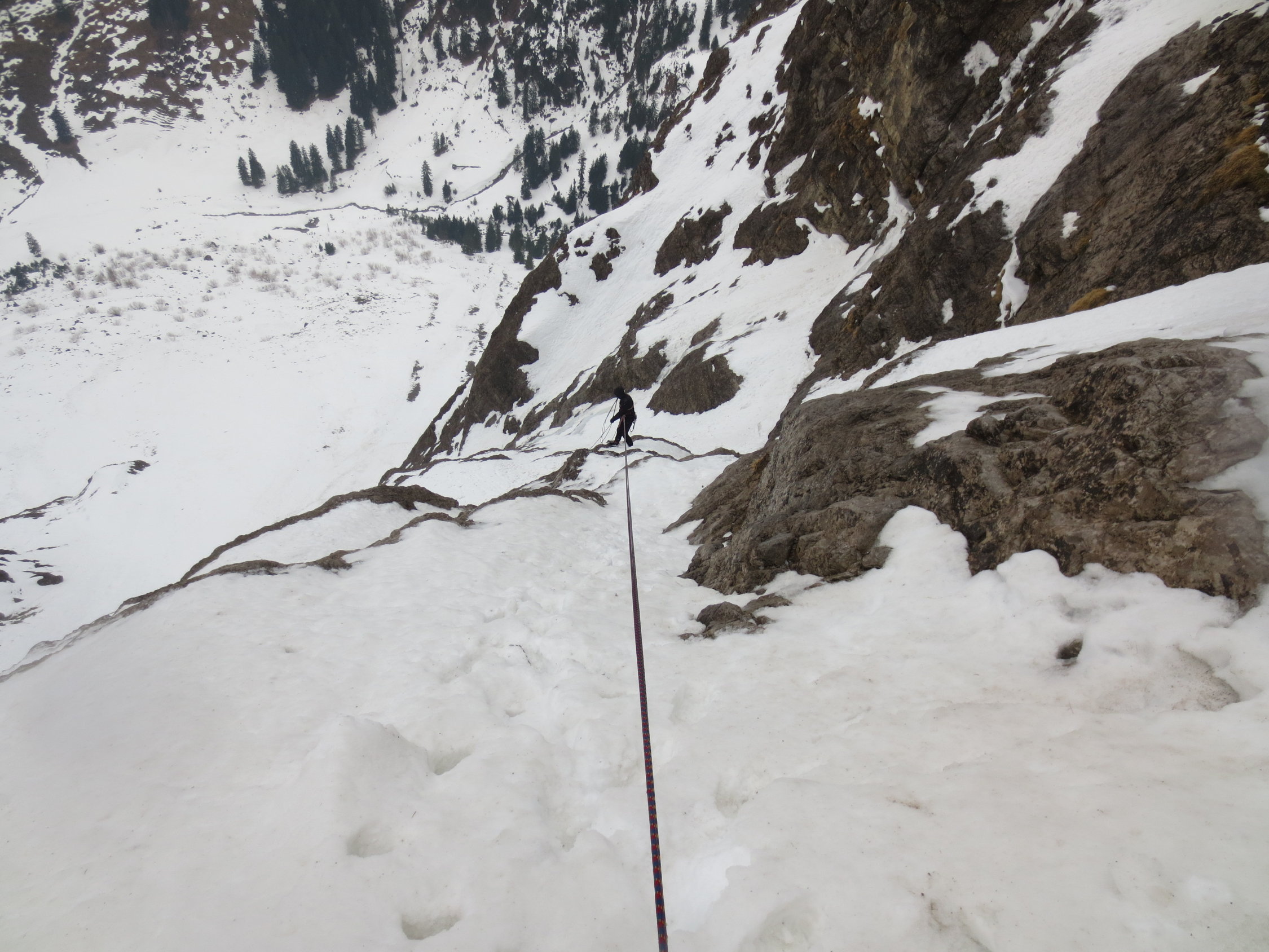 Verhältnisse wie erwartet viel zu warm (ca 3-6Grad, Nachts nicht gefroren), Eis zweite SL dünn und weiss, am Ausstieg Eisfall kann eine bis zwei 10cm Eisschrauben gesetzt werden sonst Lasur, Schneefelder nur Sülze, weder Schnee noch Boden noch Ausstiege gefroren, in der 3ten SL massiver Steinschlag mehrmals!, alle Neuschneefelder zwischen der Route und am unteren Einstieg mit Steinsplitter gelöchert. Große Altlawine über NW bis zum Bach alles freigeräumt, hier guter Aufstieg möglich. 5 Sl abgebrochen und abgeseilt da Spassfaktor fehlt und es regnet, wir heben uns die Tour auf für schöne Frosttage......, 3+4SL schönes Drytooling, vermutlich keiner in Route mussten Standplätze freigraben. 2-3 Schlaghaken empfehlenswert.